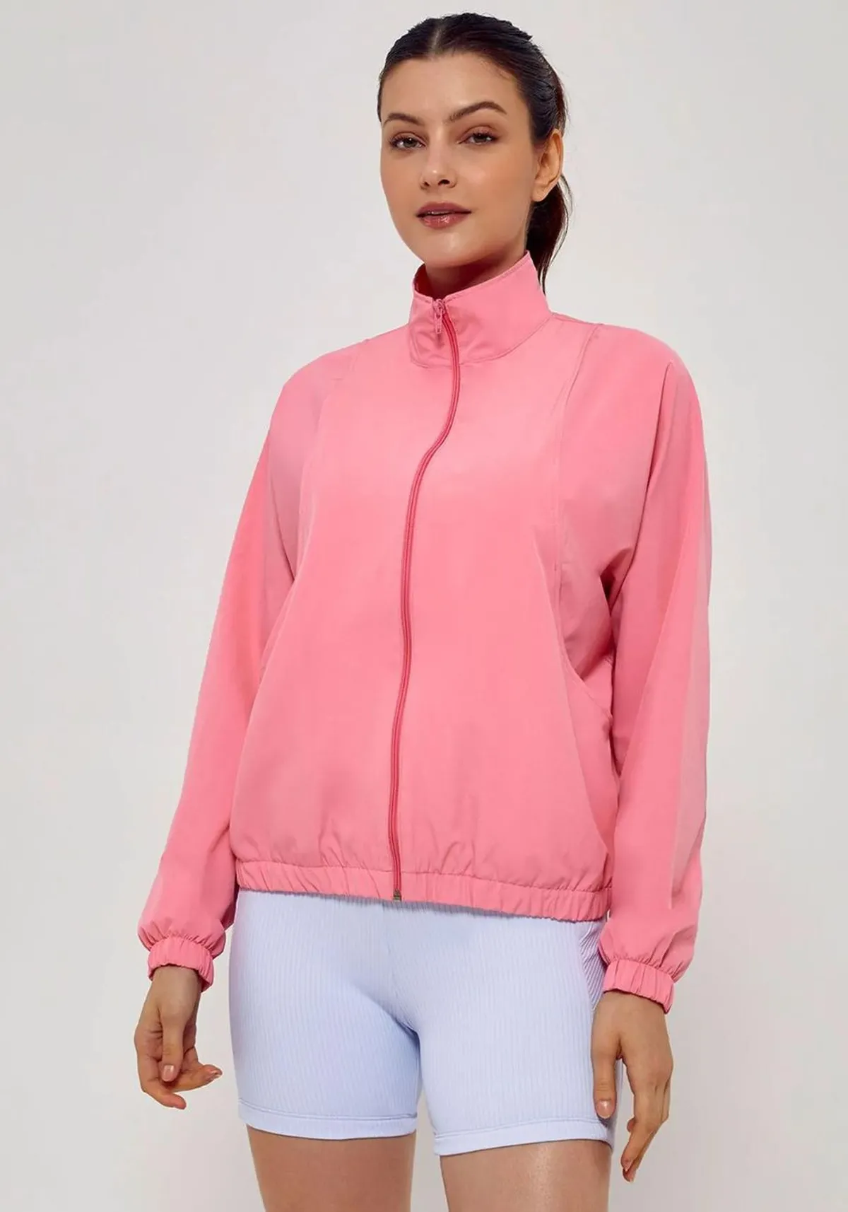 Jaqueta corta vento, modelagem alongada, levemente solta e abertura frontal com zíper.