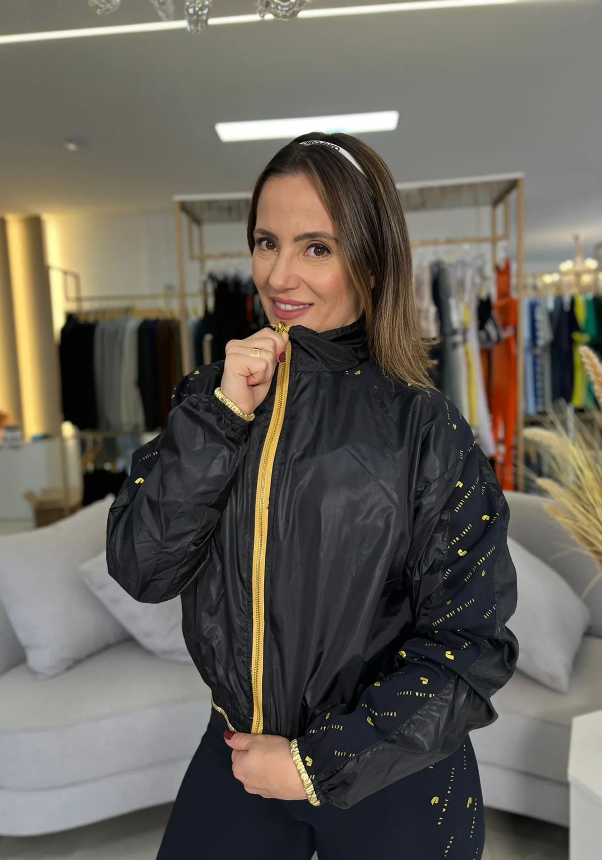 O zíper frontal e os bolsos laterais trazem praticidade, enquanto o tecido estampado em dourado é leve e confortável com toque suave.