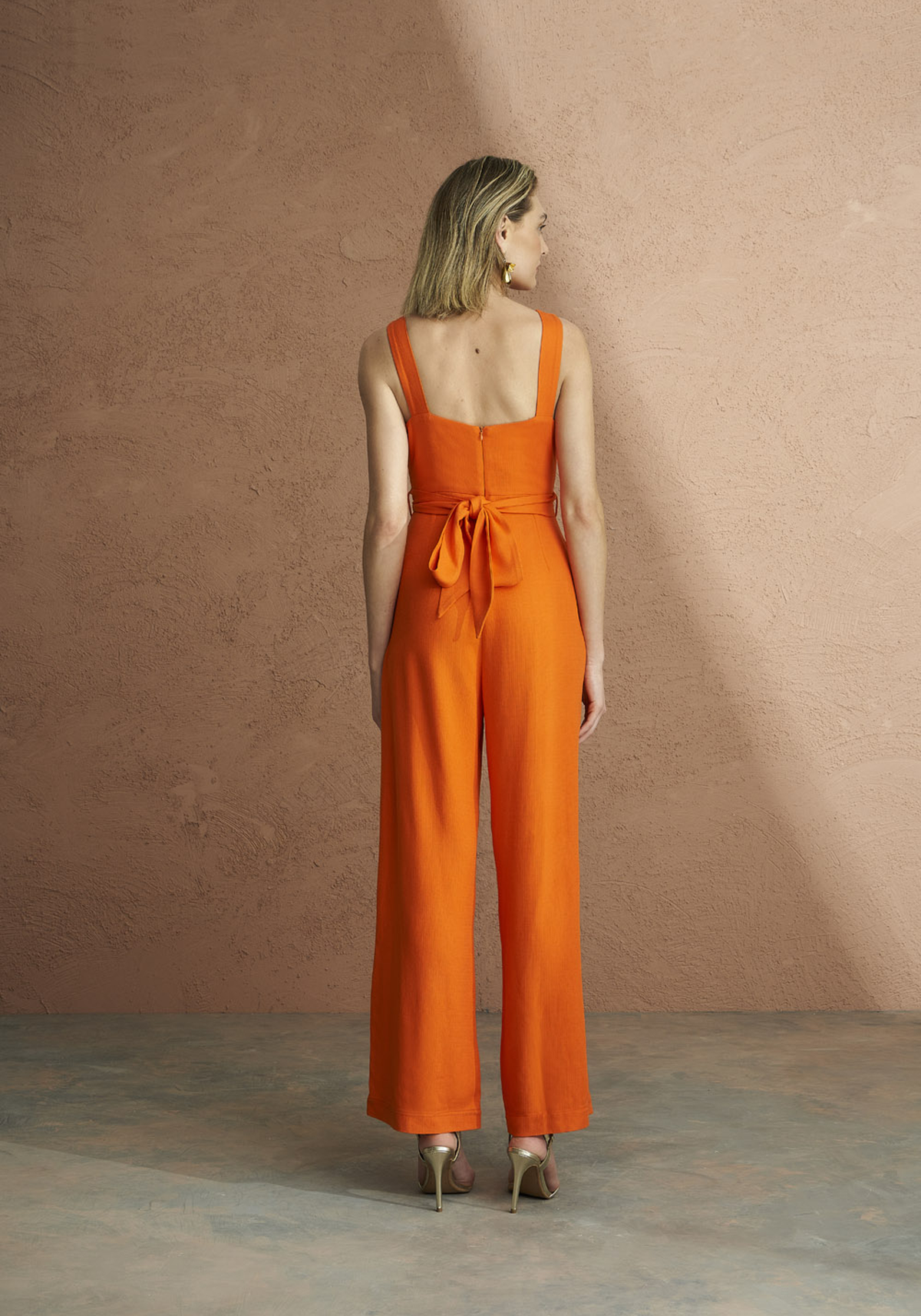 O macacão apresenta comprimento longo, modelagem justa ao corpo, gola arredondada na frente, decote quadrado atrás, alças grossas fixas, sem mangas, detalhe de abertura na barriga com barra transpassada seguindo como faixa para amarração na cintura, possui bolsos nas laterais, fechamento por zíper atrás.