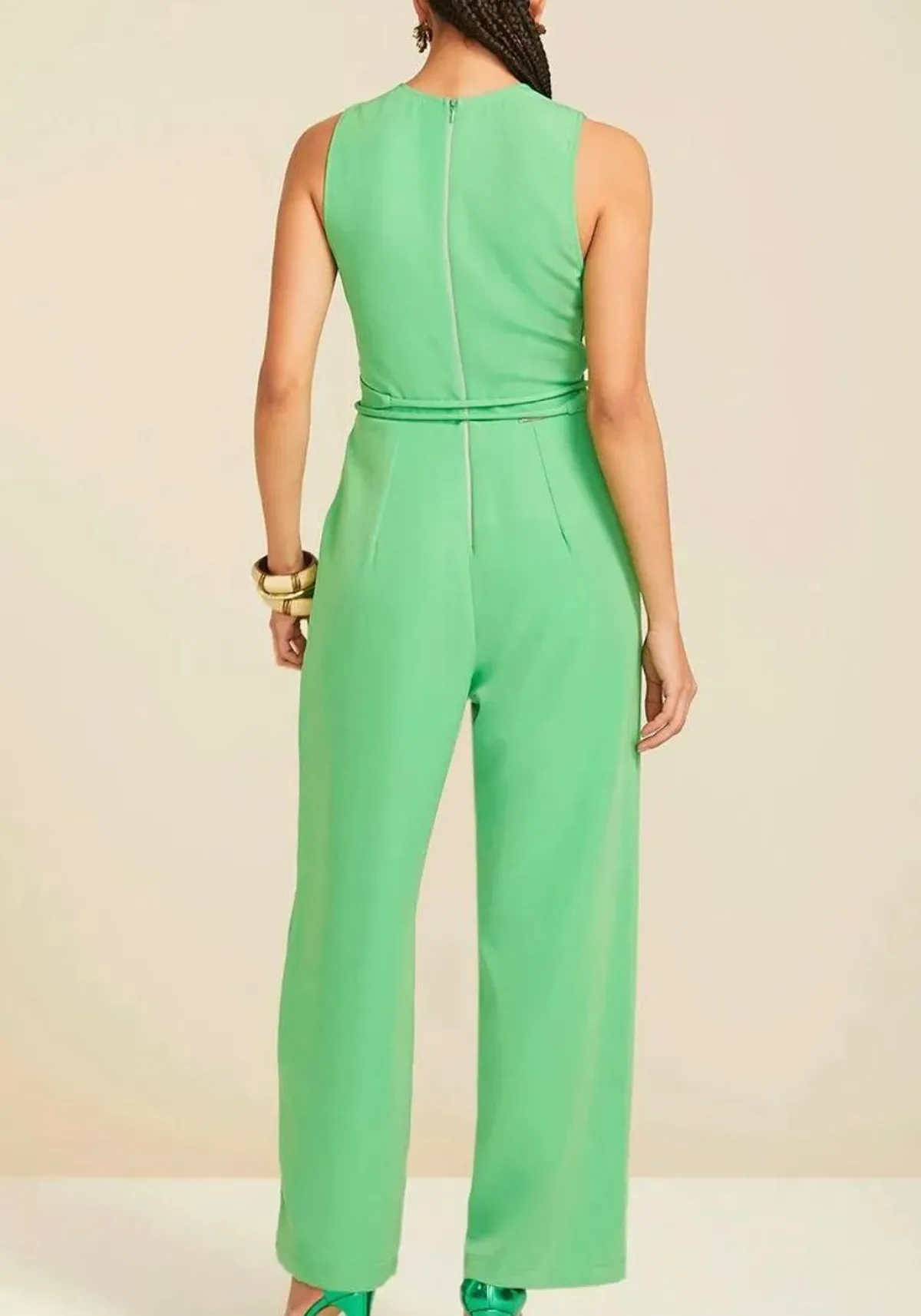 Macacão longo, modelagem reta, decote V, possui faixa para amarração na cintura.