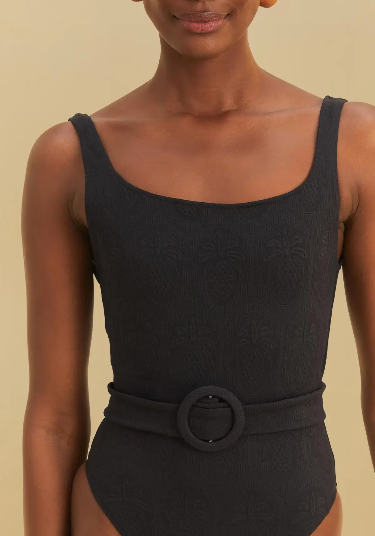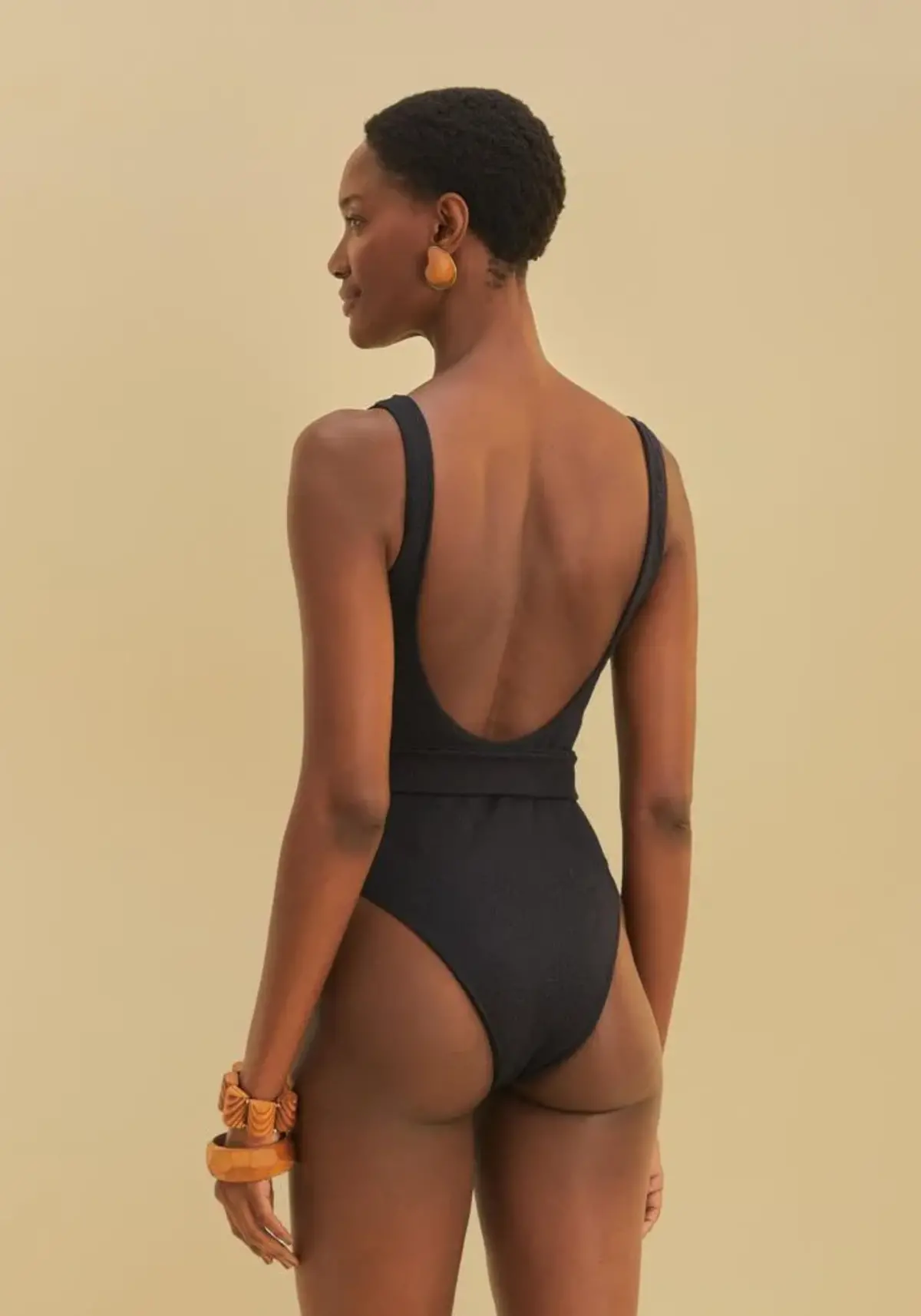 Um clássico repaginado para a temporada de sol! Este maiô da Farm combina sofisticação e estilo com sua textura inspirada em abacaxis, que dá personalidade à peça. O cinto na cintura valoriza a silhueta, garantindo um ajuste elegante e moderno. A cor preta confere versatilidade e sofisticação, sendo perfeita para diferentes combinações de acessórios e saídas de praia. Ideal para quem busca conforto, estilo e um toque tropical sofisticado.