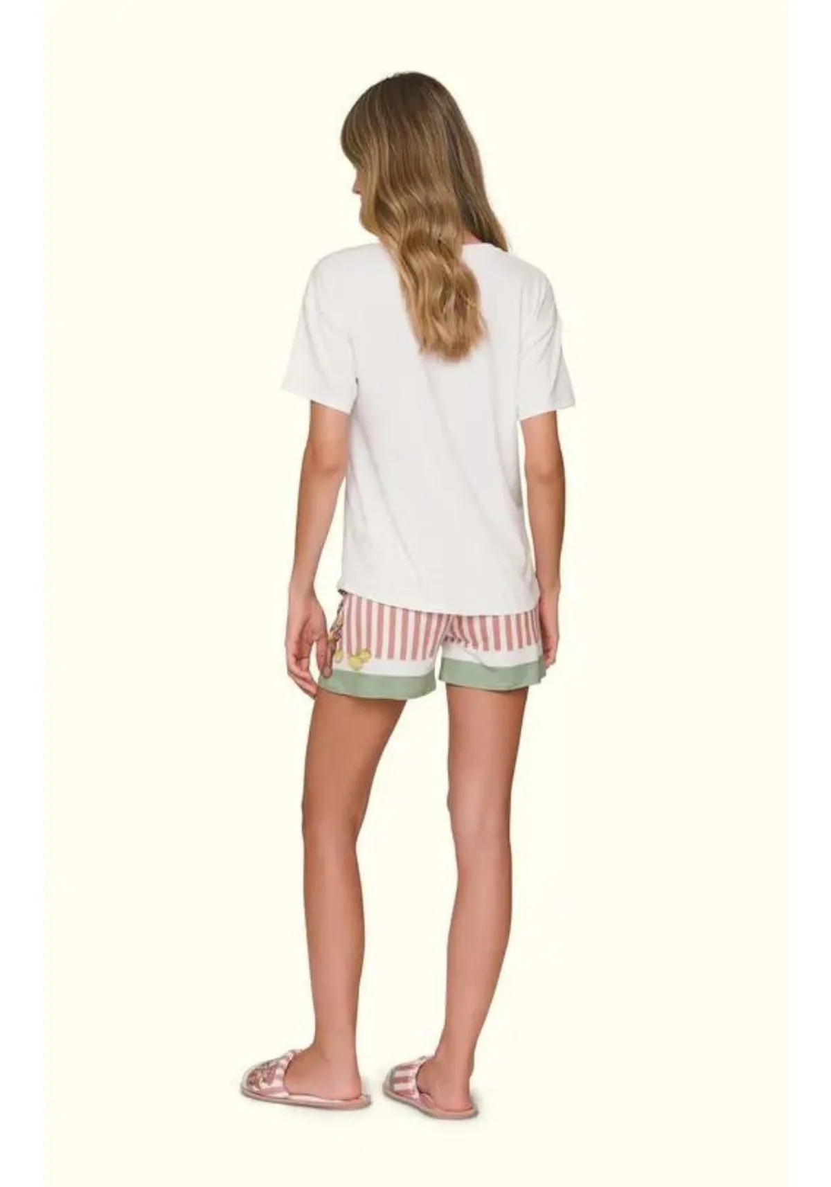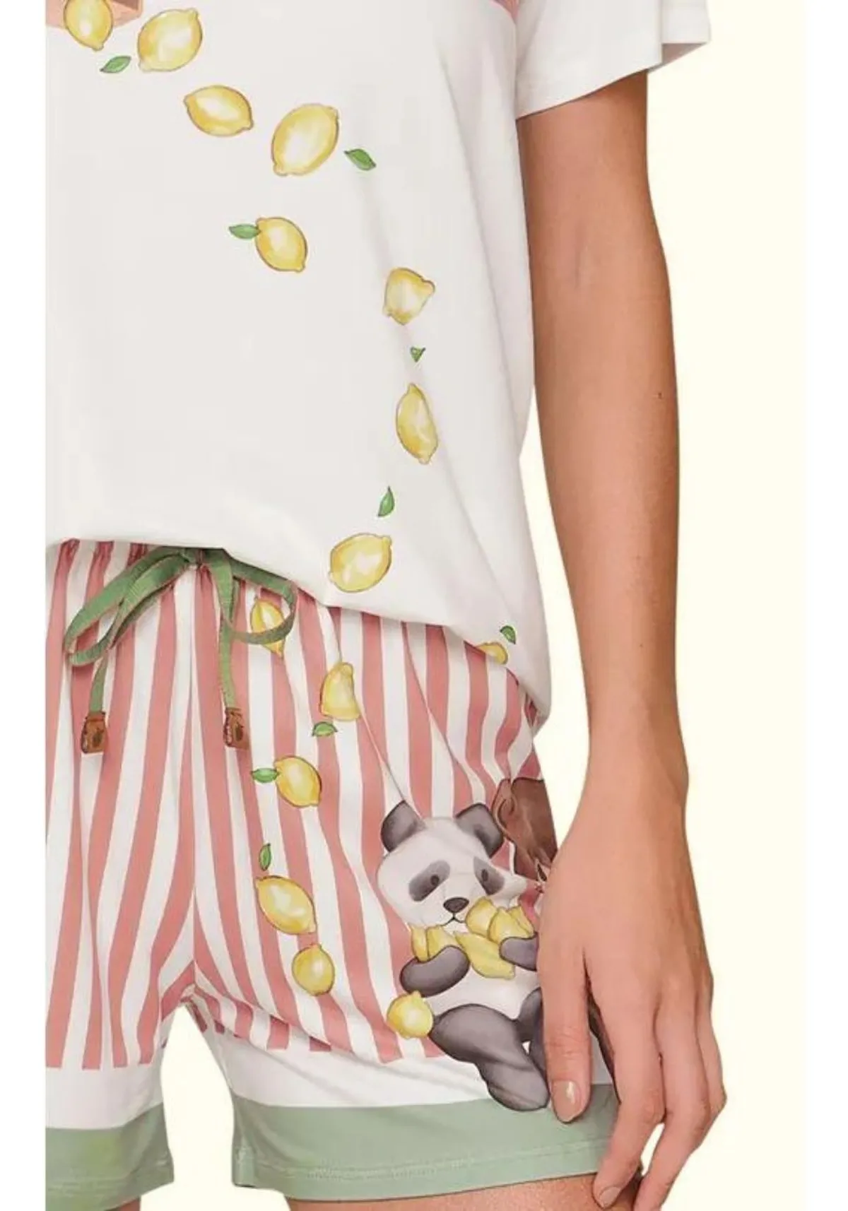 A camiseta possui estampa minimalista personalizada com urso e limões, o short possui estampa personalizada de listras nas cores rosa, off white e verde com urso e limões.