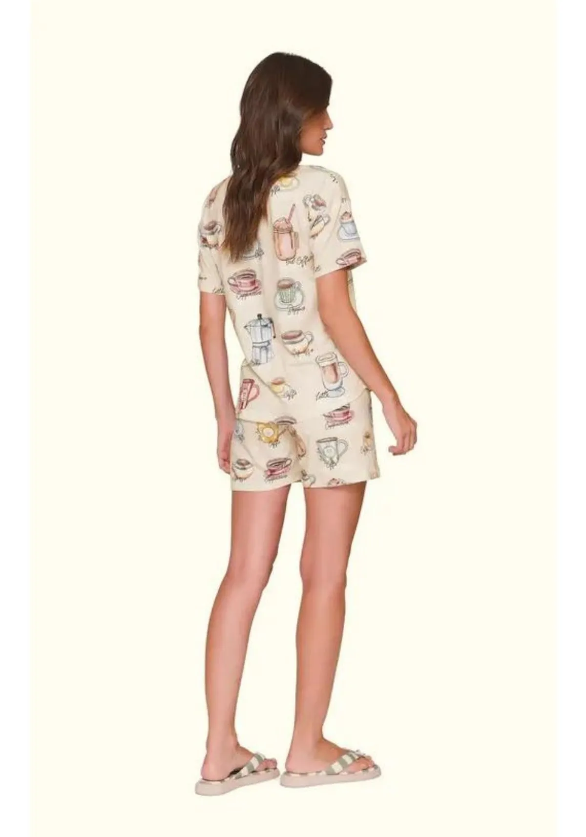 Conjunto de pijama composto por uma camiseta e um short, em malha com toque de pêssego.