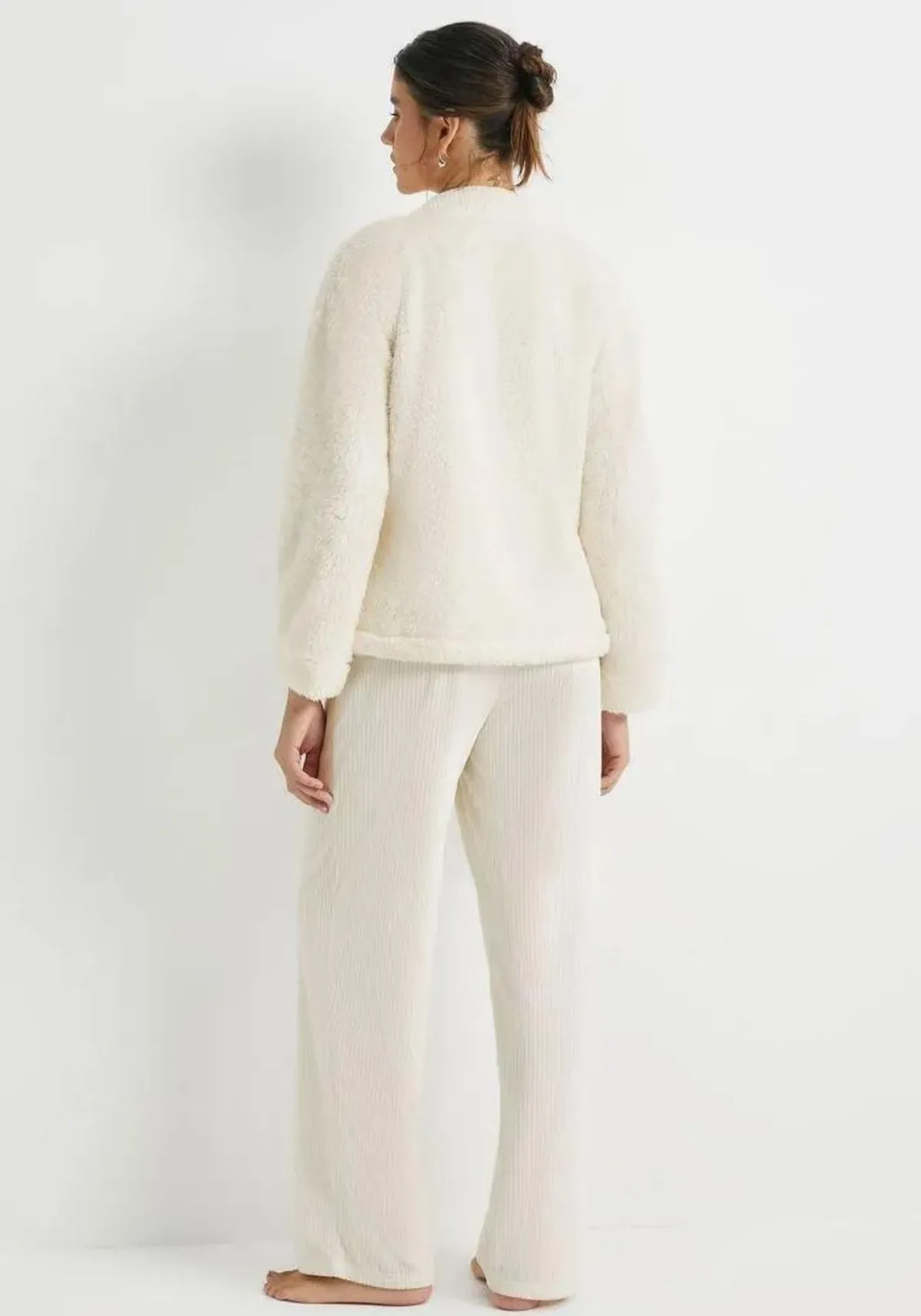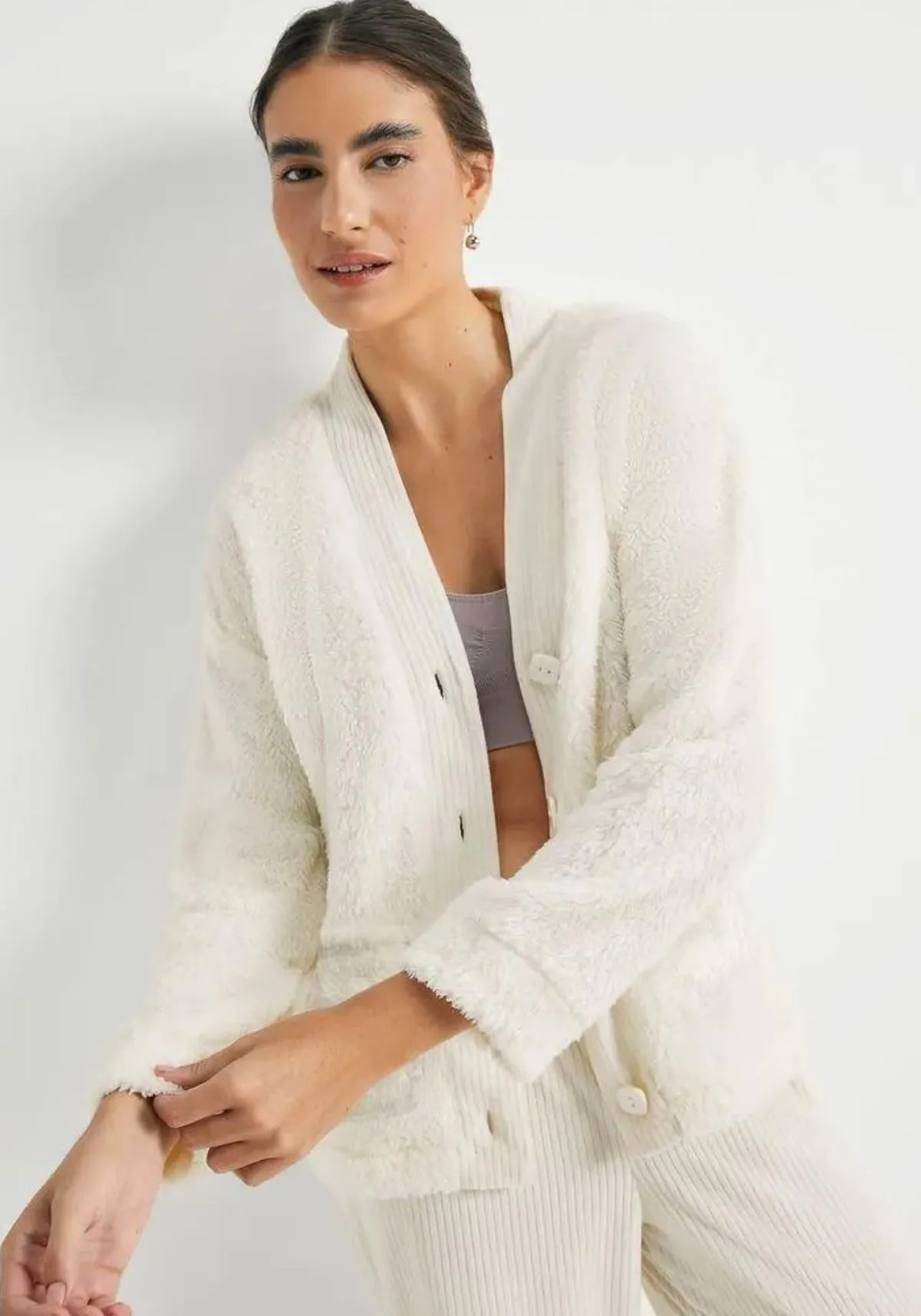 Conjunto de pijama composto por casaco tipo cardigan de manga longa e calça, em fleece que garante toque aveludado e mais encorpado, tem textura peluciada, super macia e quentinha.
