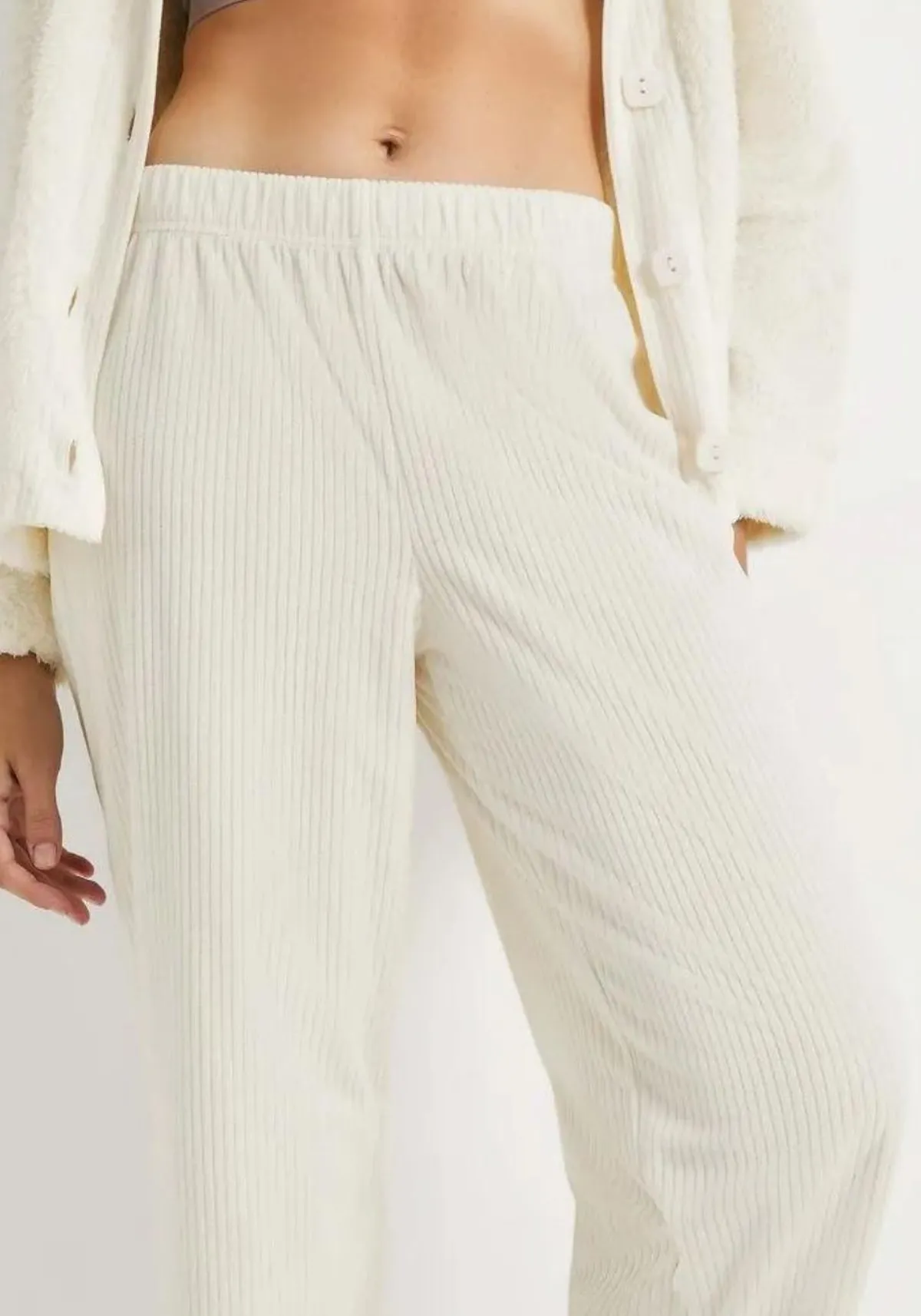 Calça feita em um tecido canelado e aveludado, o tecido tem um peso leve o que proporciona maior conforto e permite que os movimentos fiquem mais livres na hora de dormir.