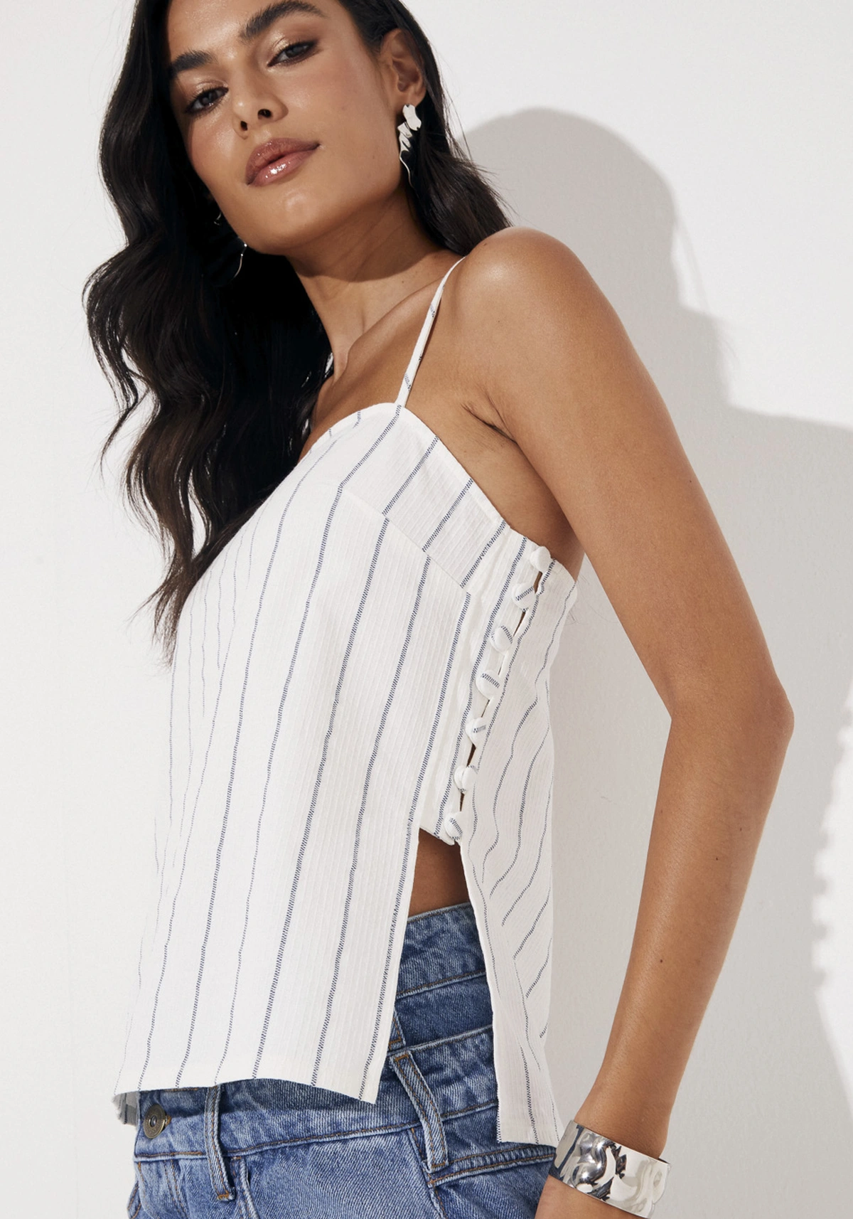 A regata apresenta modelagem reta, shape solto, sem mangas, alças finas com regulagem, decote reto, detalhe de fileira de botões na lateral com fenda abaixo, não possui bojo.