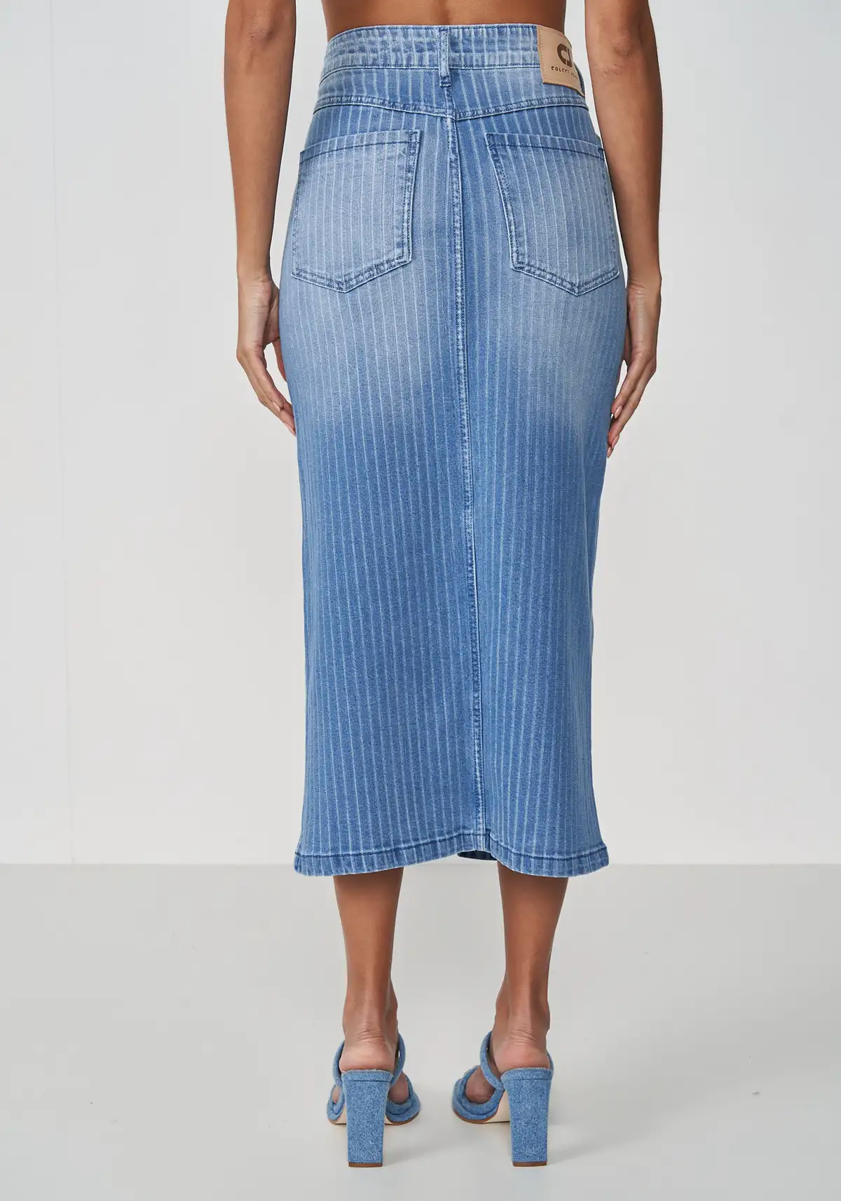 Saia jeans midi listrada com fenda na frente, uma peça diferenciada e moderna para compor looks glamurosos.