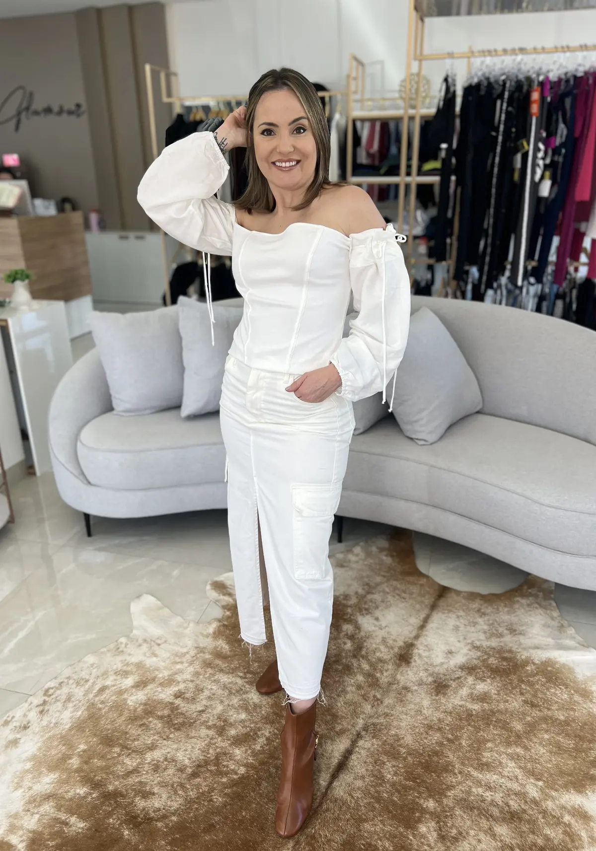 Saia midi em sarja com fenda, uma peça moderna e versátil que combina estilo, conforto e praticidade.