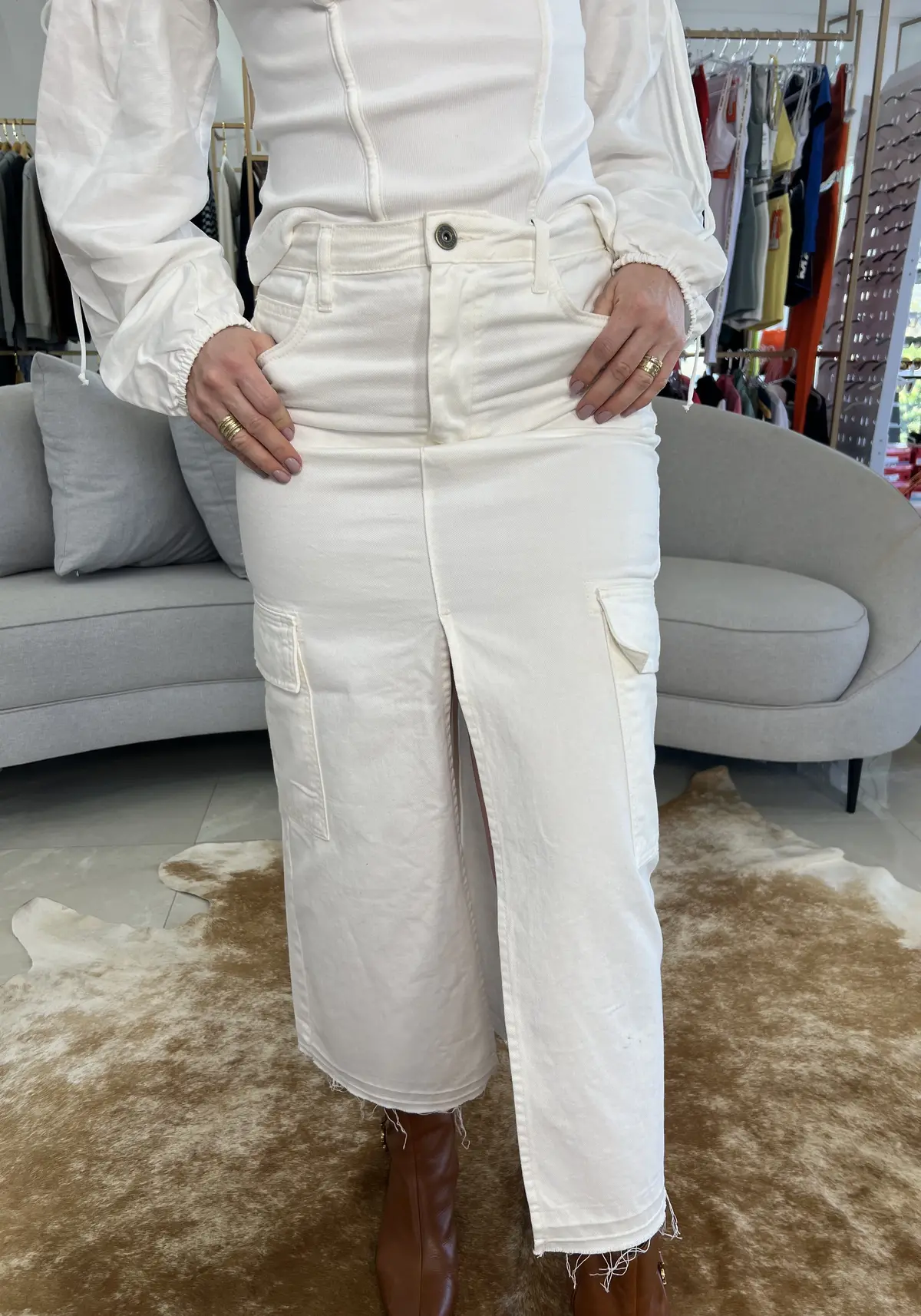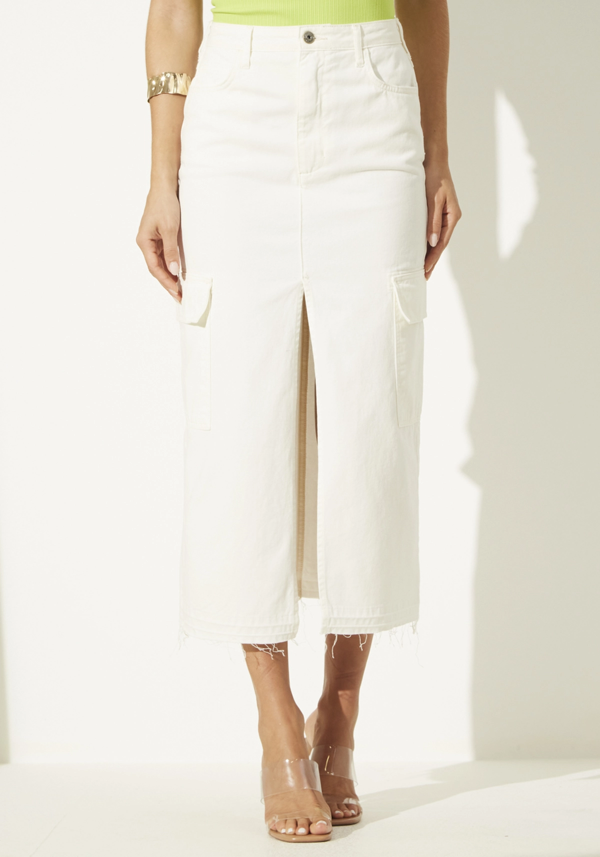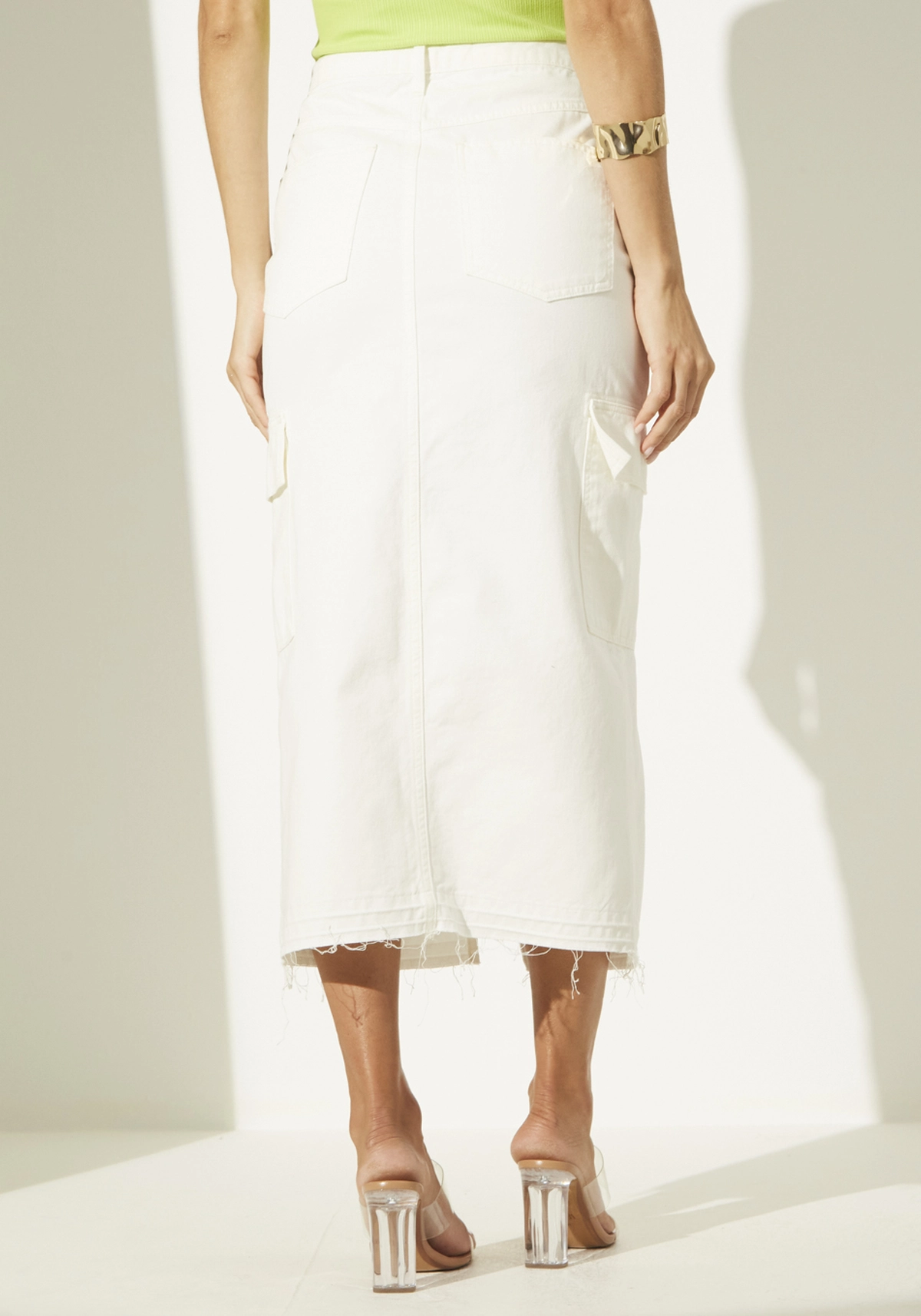 A saia apresenta comprimento midi, modelagem slim, shape reto, cintura alta, cós com passantes, bolsos funcionais na frente e atrás, bolsos cargo na frente, fechamento por zíper e botão na frente, fenda na frente, barra com acabamento desfiado.