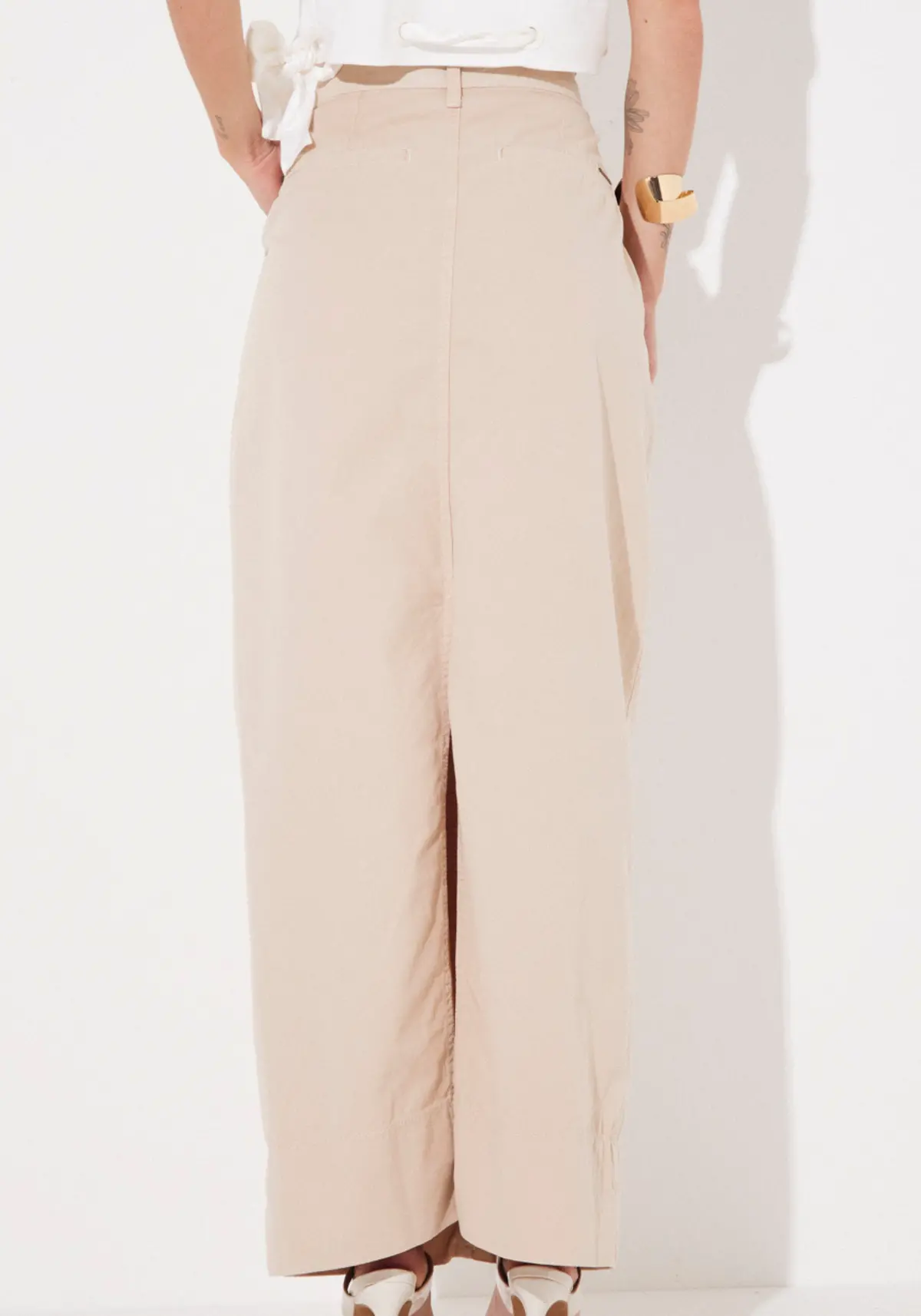 Saia: Cós alto, modelagem reta, comprimento longo, fenda nas costas, barra tradicional. Tecido: Algodão. Detalhes: Cós com botão e passantes, braguilha com zíper interno, bolsos faca, bolsos traseiros vivo, fenda nas costas, barra com acabamento tradicional.