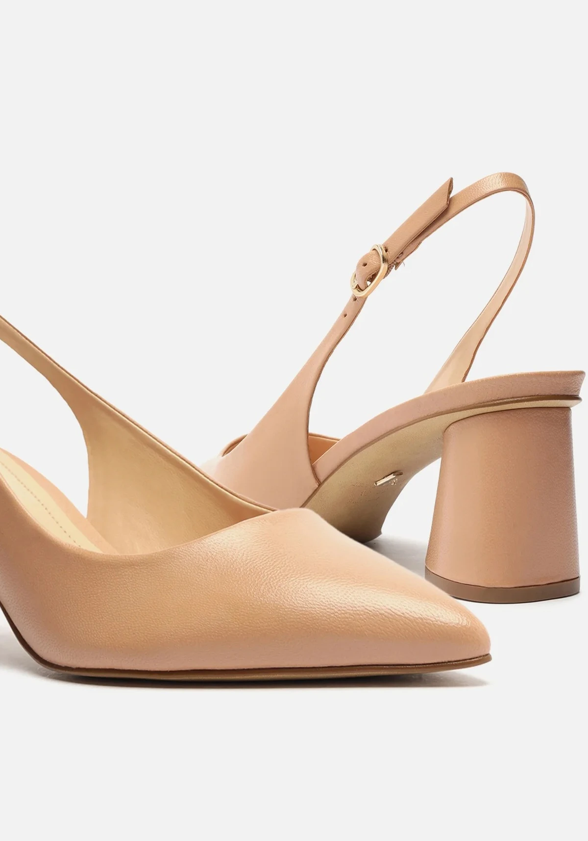 Fechado, traz cabedal com recorte redondo sobre o peito do pé e ajustado nas laterais. Aberto atrás, possui tira fina com fivela metálica em torno do calcanhar e palmilha bege com inscrição do nome da marca. Exibe todo o peito e parte traseira do pé.