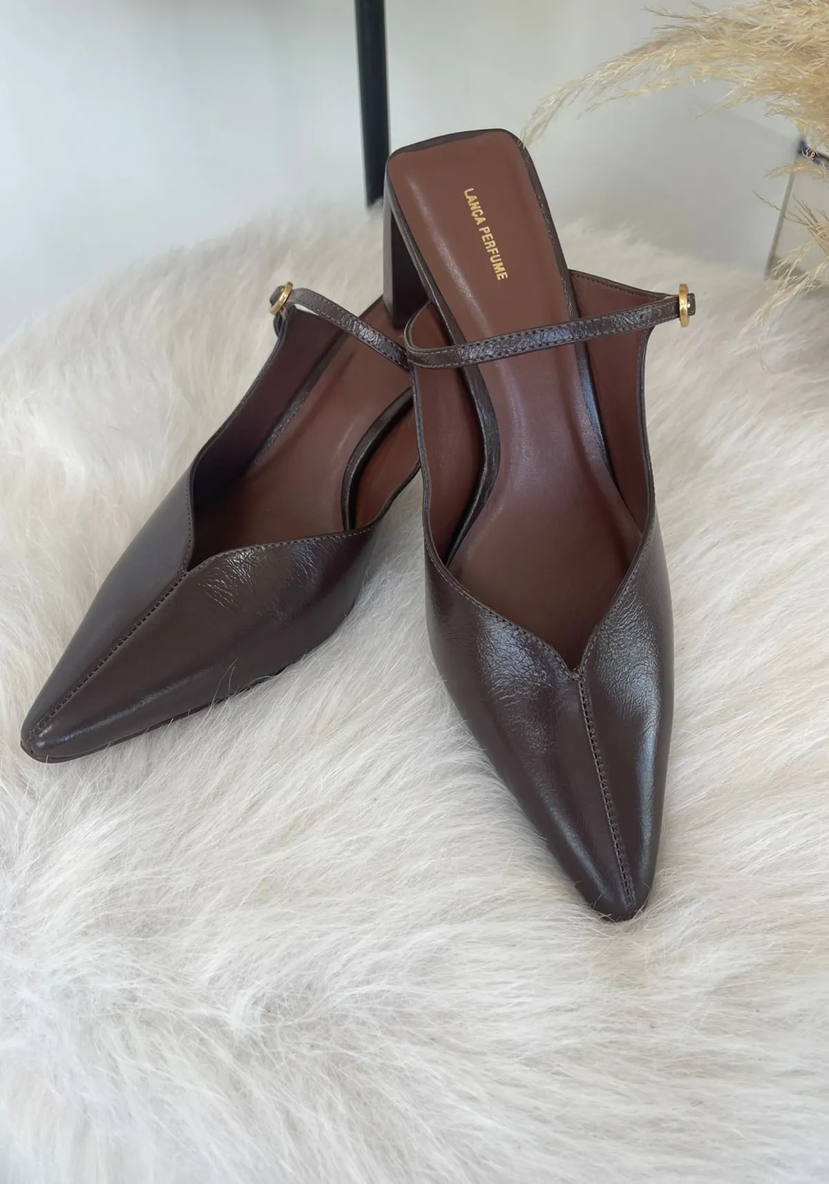 O scarpin mule da Lança Perfume traduz elegância e praticidade em uma única peça. Com design sofisticado e tom marrom escuro atemporal, ele combina o bico fino clássico do scarpin com a praticidade do modelo mule – que deixa o calce mais fácil e o visual moderno.