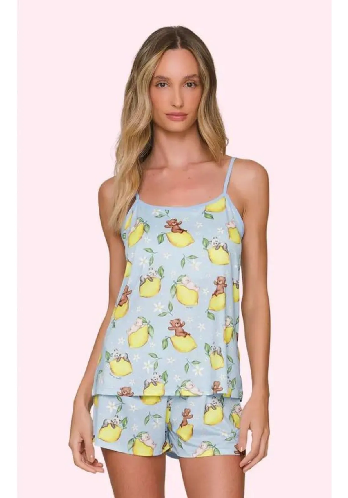 Possui estampa fofa personalizada de limões e ursinhos, com fundo azul claro.