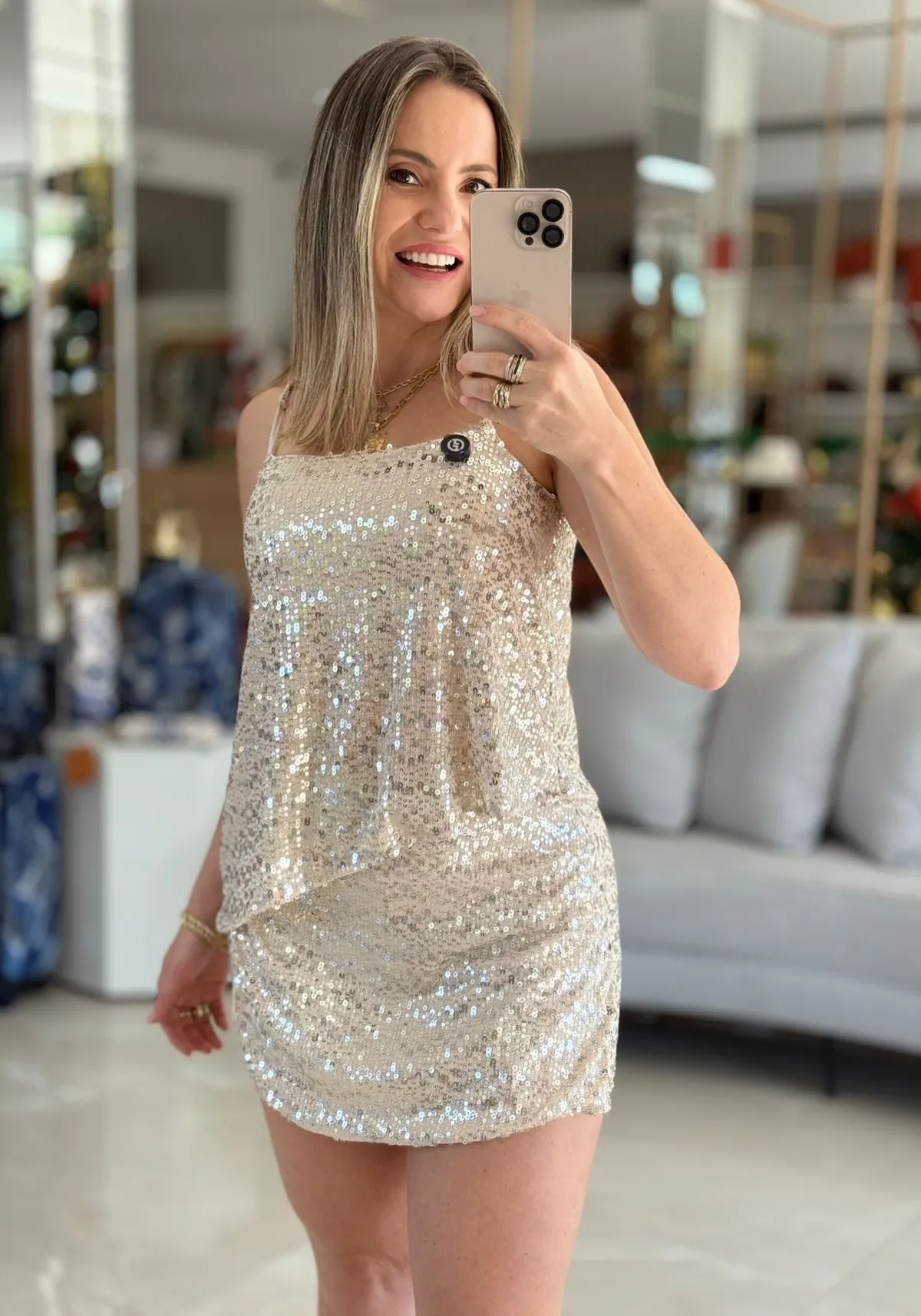 O destaque da peça fica por conta da aplicação de paetês, que adiciona charme e um toque glam ao look, sem perder a elegância. A modelagem short saia une praticidade e feminilidade, enquanto o comprimento curto valoriza a silhueta de forma leve e atual.