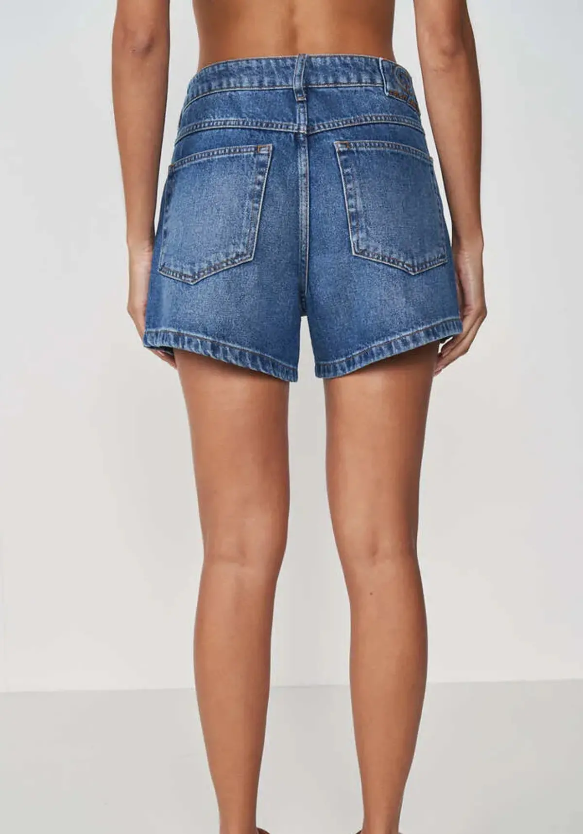 Short jeans com cintura alta, cós com passantes, fechamento por botão e zíper, bolsos frontais e traseiros, comprimento acima do joelho e modelagem soltinha.