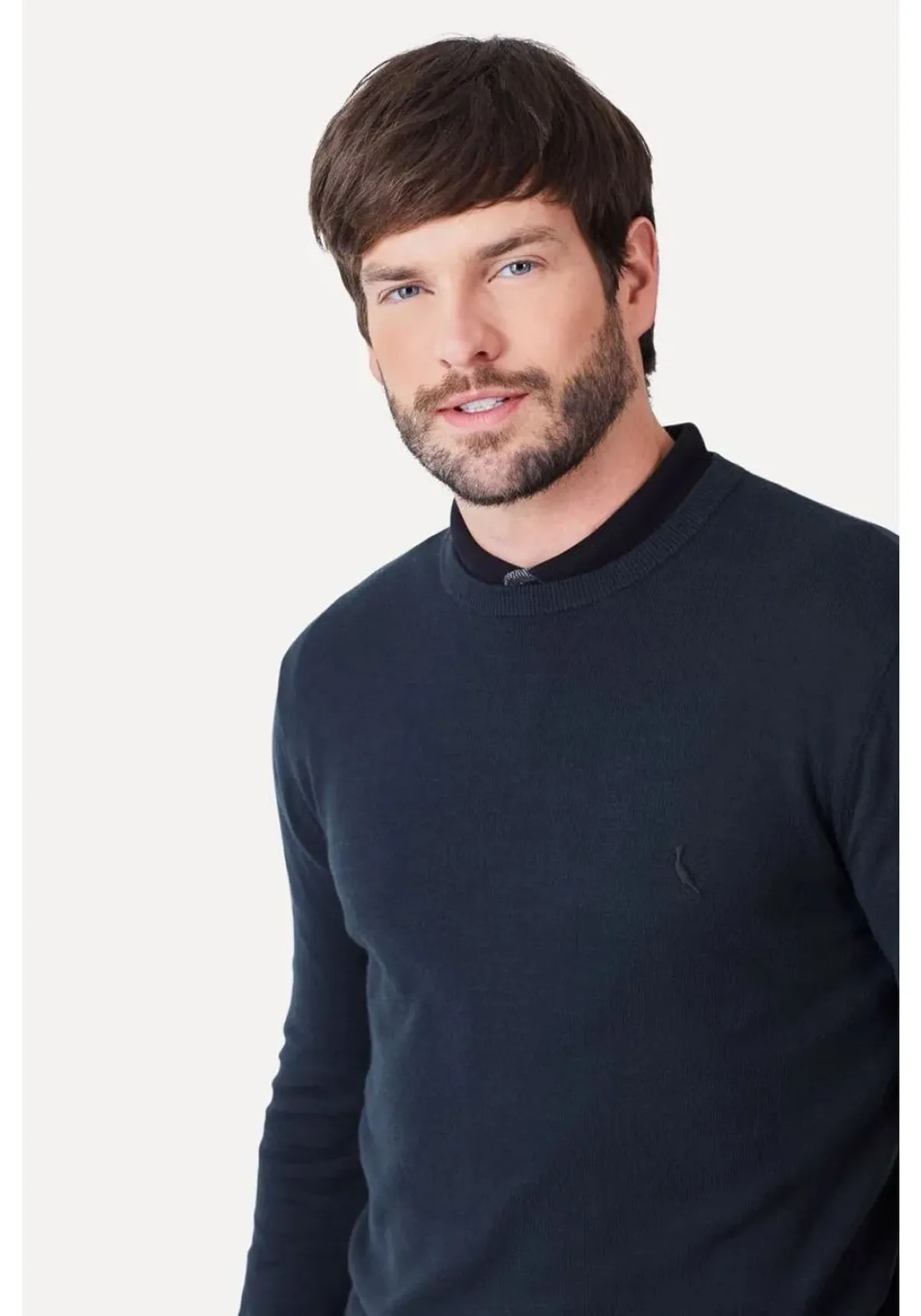 O suéter apresenta modelagem justa, mangas longas com punho, gola arredondada, pica pau bordado no peito, punho, barra e cós com textura canelada.