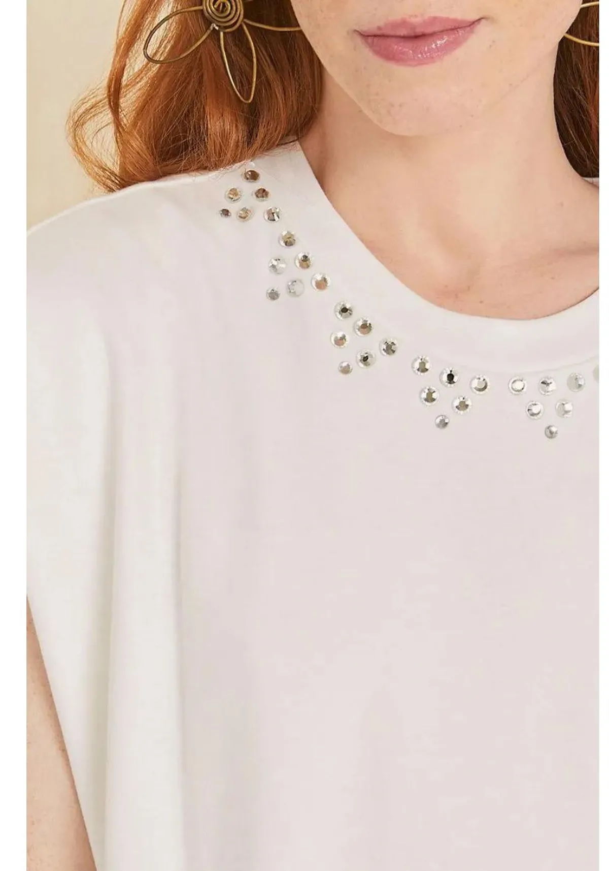 T-shirt com detalhe de aplicações de strass trazendo modernidade e versatilidade em uma só peça.