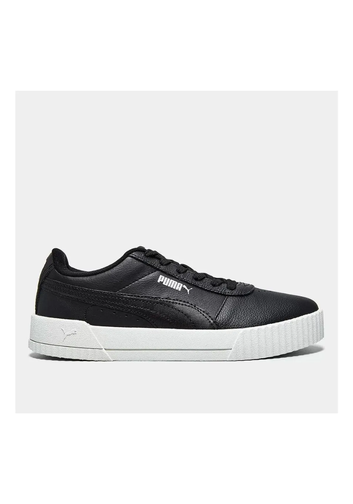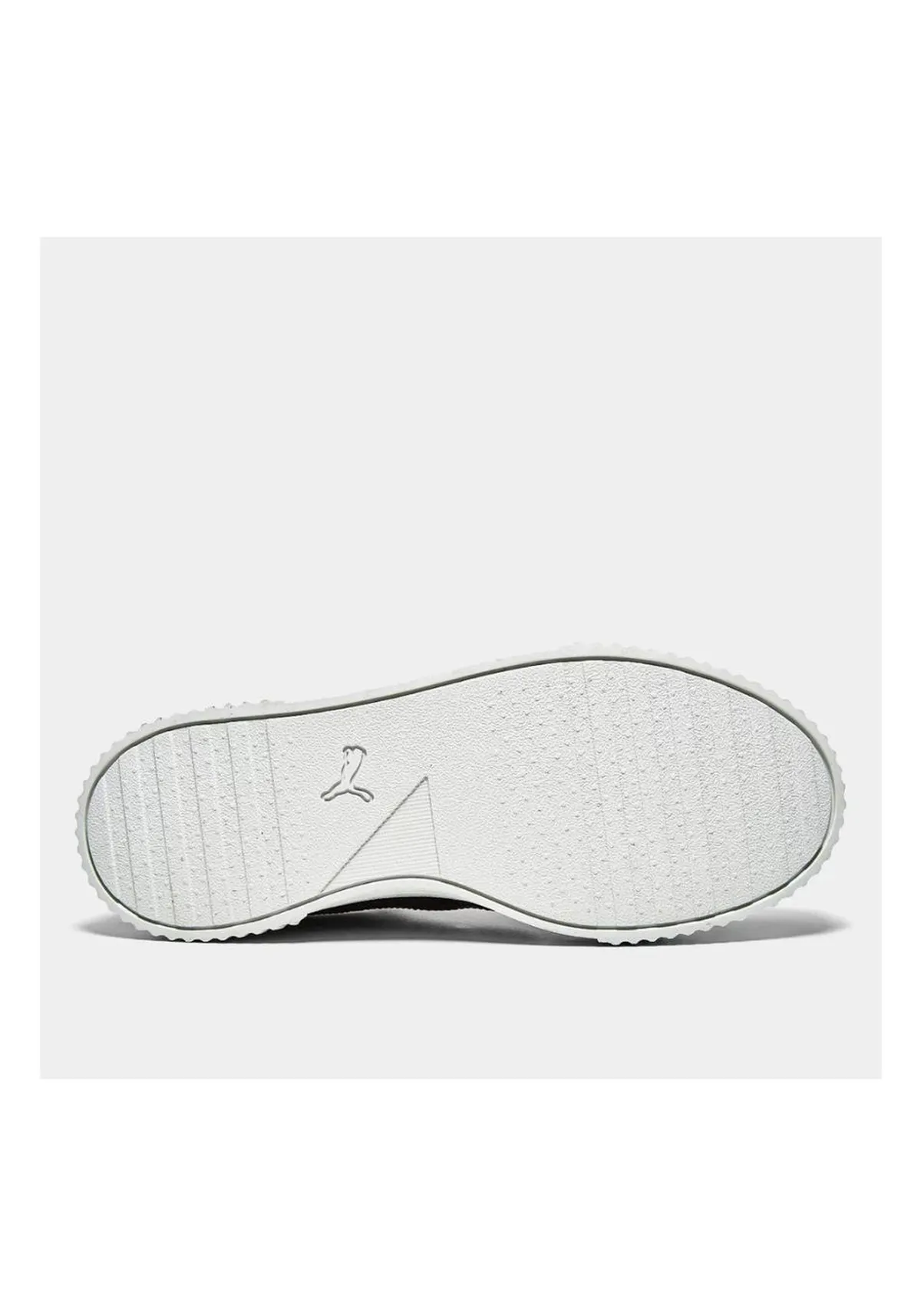 Seu design é de cor preto, solado branco e traz pequenos detalhes, como o logo Puma Cat, em cor branco.