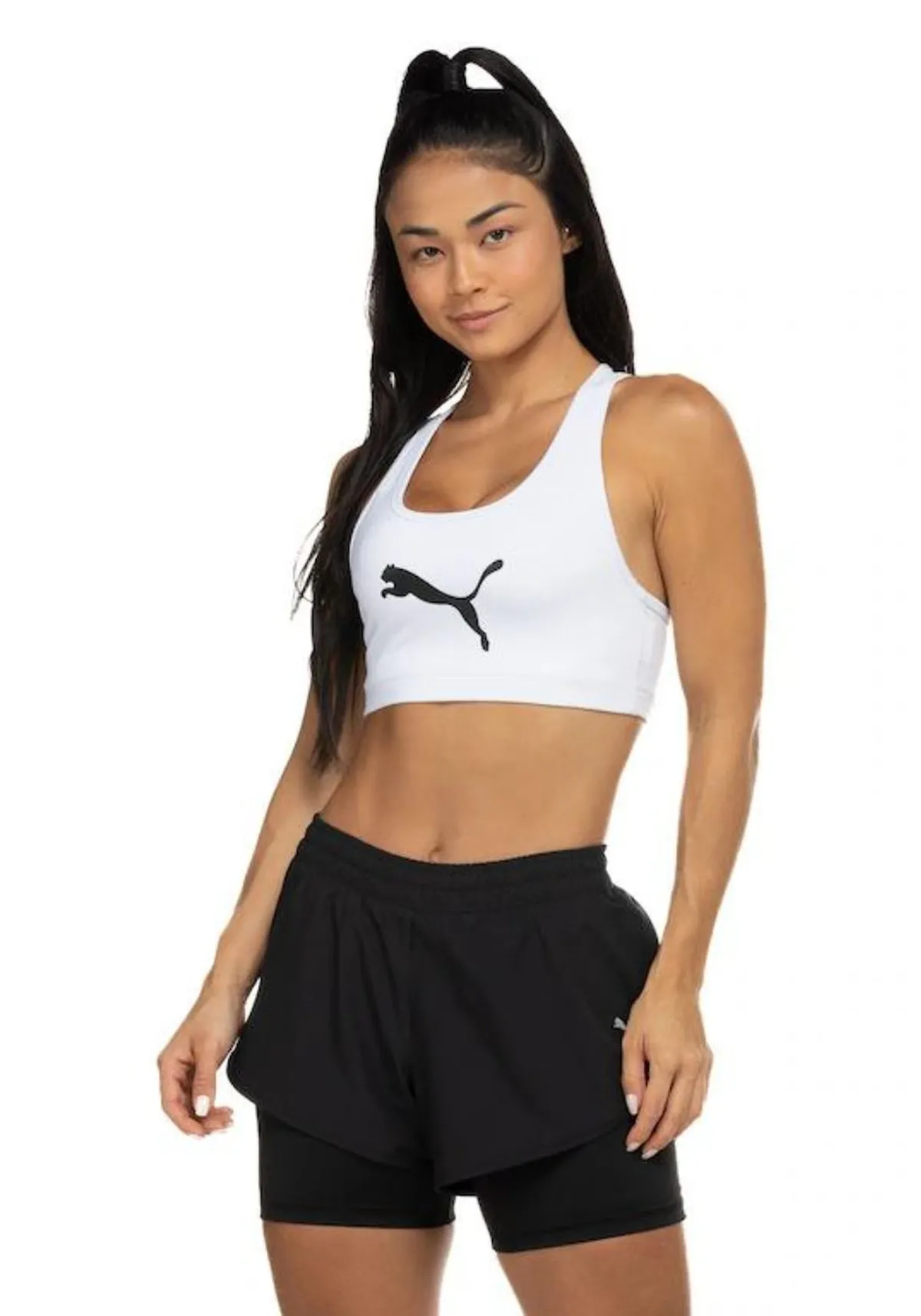 O top apresenta modelagem slim, alças grossas sem regulagem, decote redondo na frente, decote nadador nas costas, cós com elástico interno, logo puma na frente, sustentação para médio impacto, não possui bojo.