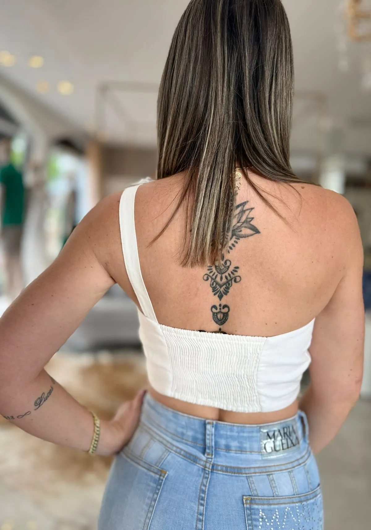 Top com alique de flores na cor off, latex na parte de trás, manga unica.