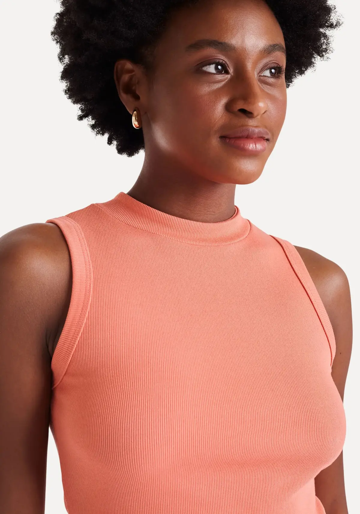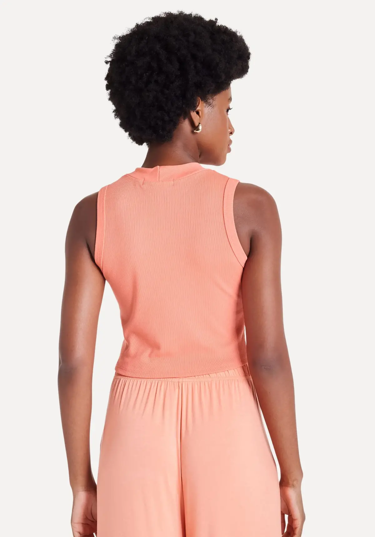 Top crooped, com gola alta e cavas em nadador, sua malha Rib se ajusta ao corpo, peça ideal para composição de looks atuais e descolados.