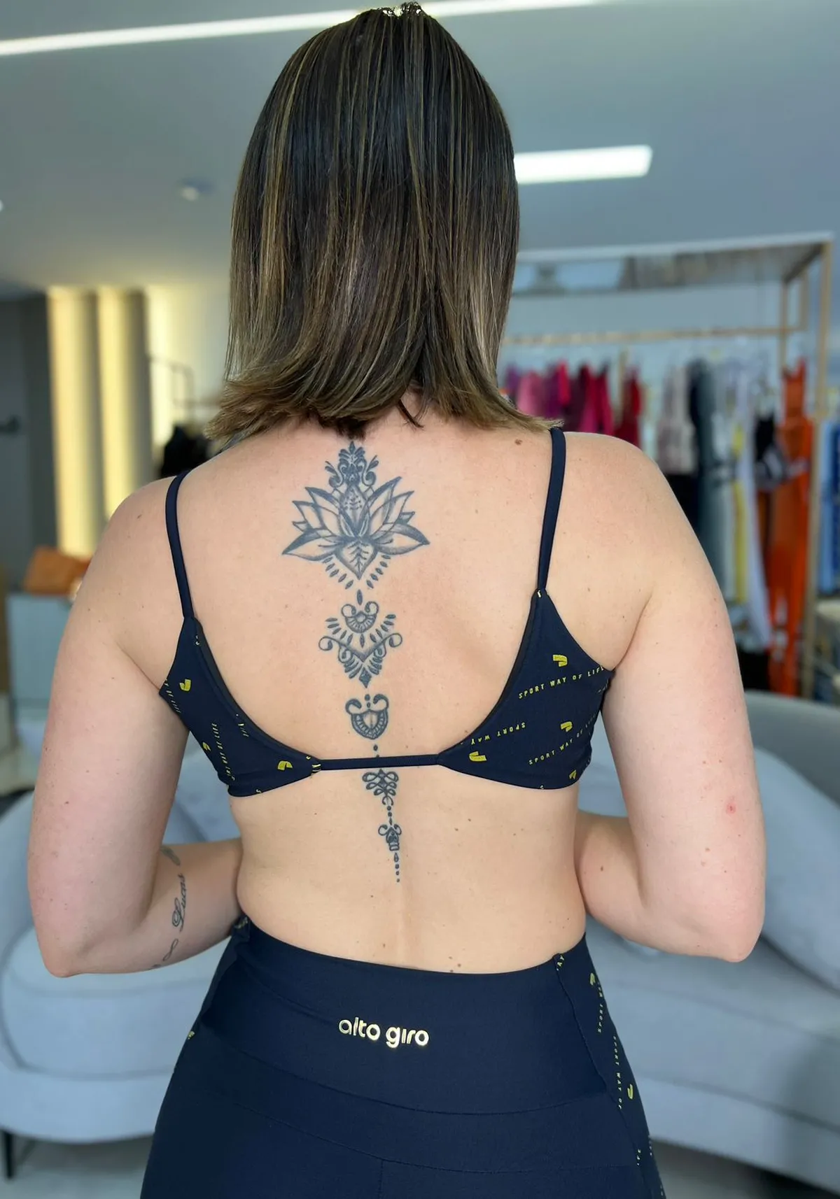 O decote nas costas proporciona maior respirabilidade ao corpo, o bojo removível te dá conforto e opções para vestir da forma que mais agradar. Possui alças finas fixas, com estampa da logo na cor dourada, trazendo total destaque a peça.