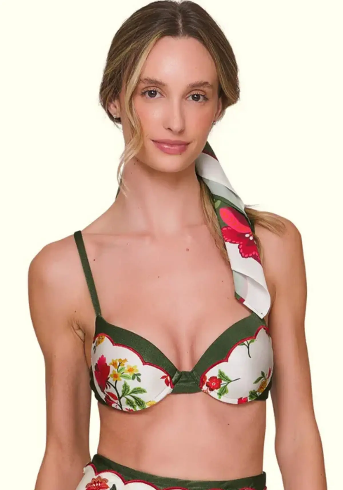 Top meia taça com sustentação extra em tecido de poliamida com leve brilho. Possui a lateral mais larga, bojo fixo, aro abaixo do busto, alças ajustáveis e fechamento costas com metal banho ouro. Recebe um recorte estampado em corte a laser com bordado no contorno. Uma composição sofisticada, com acabamento elegante.