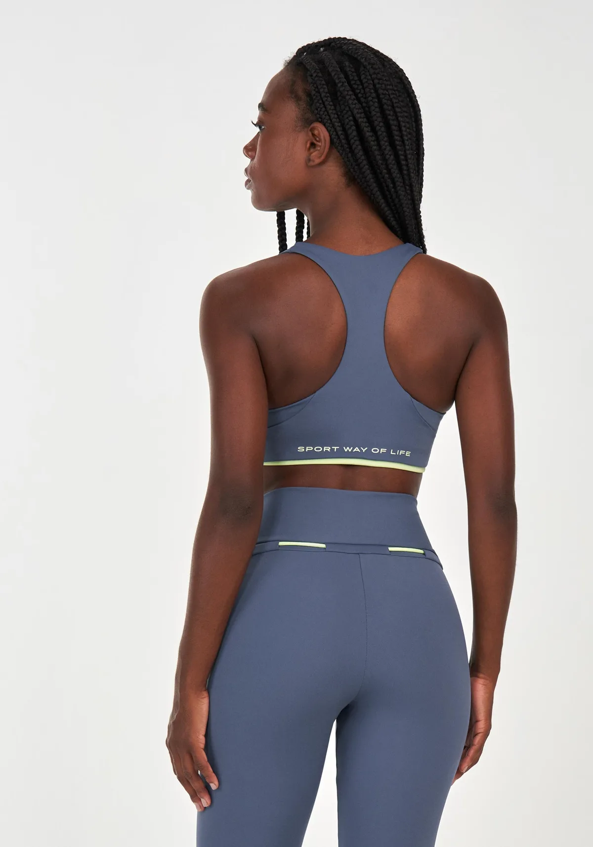 O top apresenta modelagem slim, shape justo, comprimento cropped, decote nadador nas costas, decote redondo na frente, possui bojo, detalhe de recortes na cor verde, e estampa minimalista atrás.