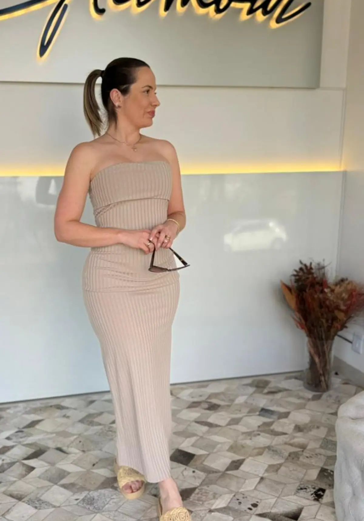 A cor nude, suave e neutra, traz um ar moderno e atemporal, ideal para compor produções delicadas ou contrastar com acessórios marcantes.