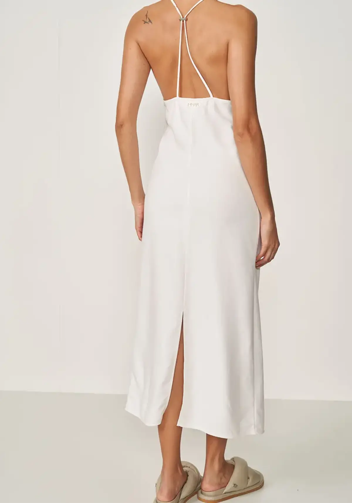 O vestido apresenta shape comfy, modelagem slim, comprimento midi, alças finas e detalhe canelado.