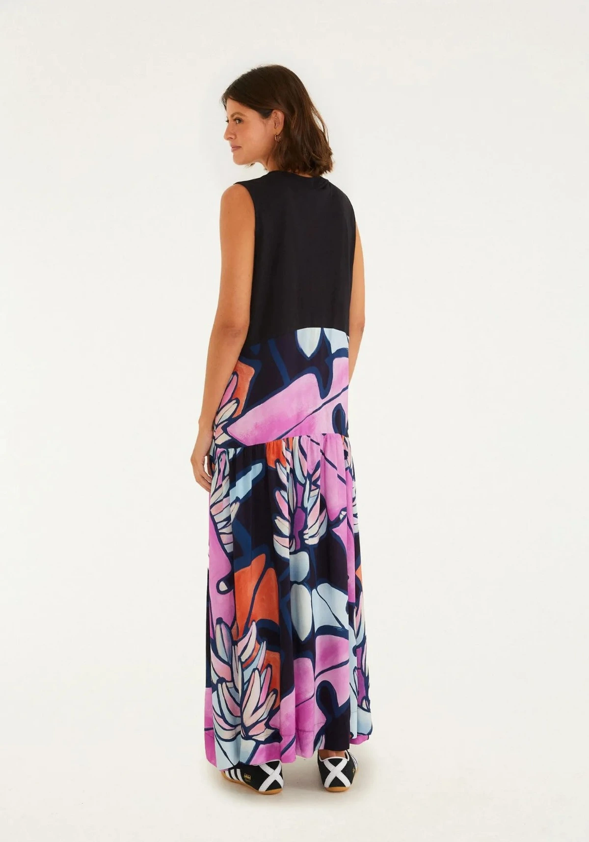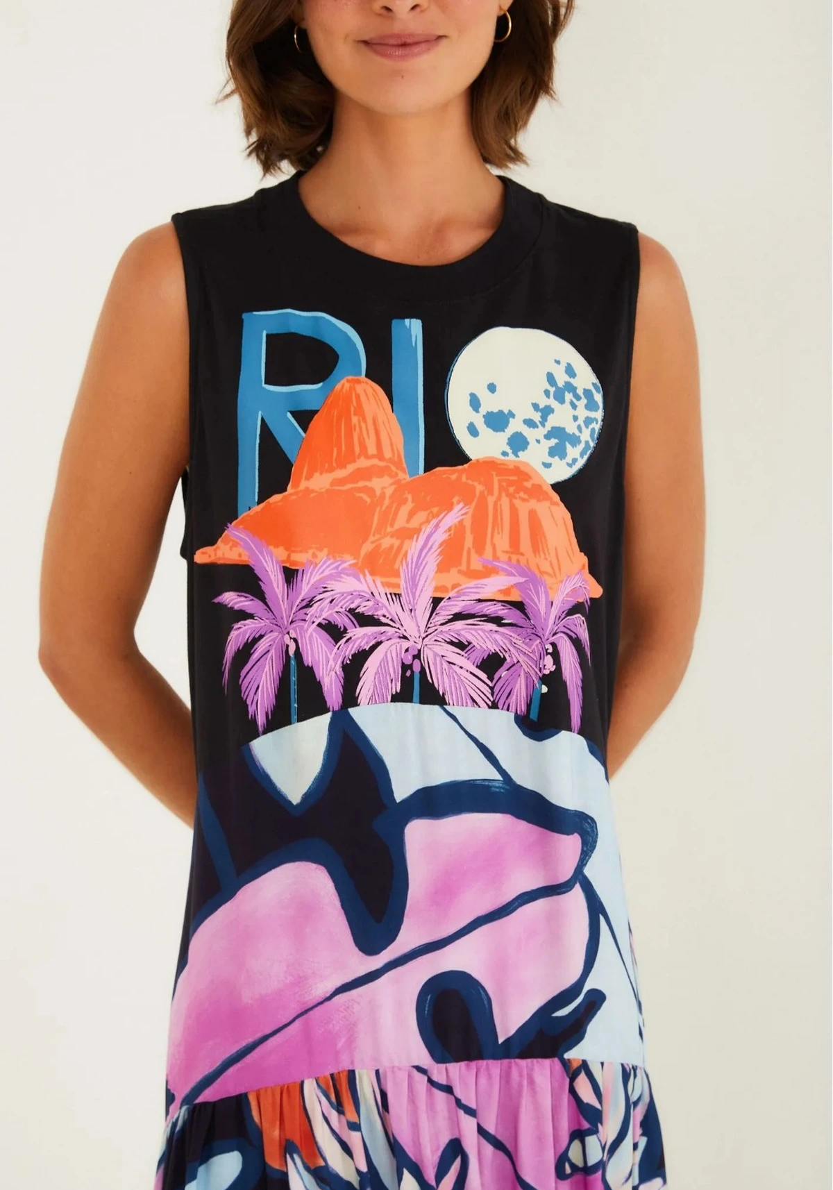 Sugestão de estilo: combine com sandálias rasteiras e bolsa de palha para um look descontraído de fim de semana, ou aposte em acessórios vibrantes para realçar a proposta colorida e moderna.