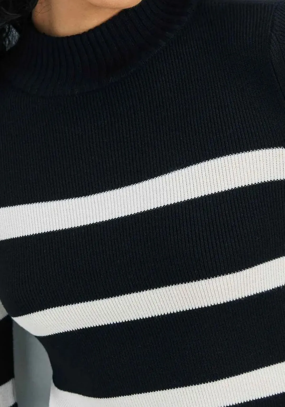 O vestido apresenta modelagem acinturada, comprimento curto, mangas longas com punho, gola alta, não possui bojo, listrado nas cores preto e off white.