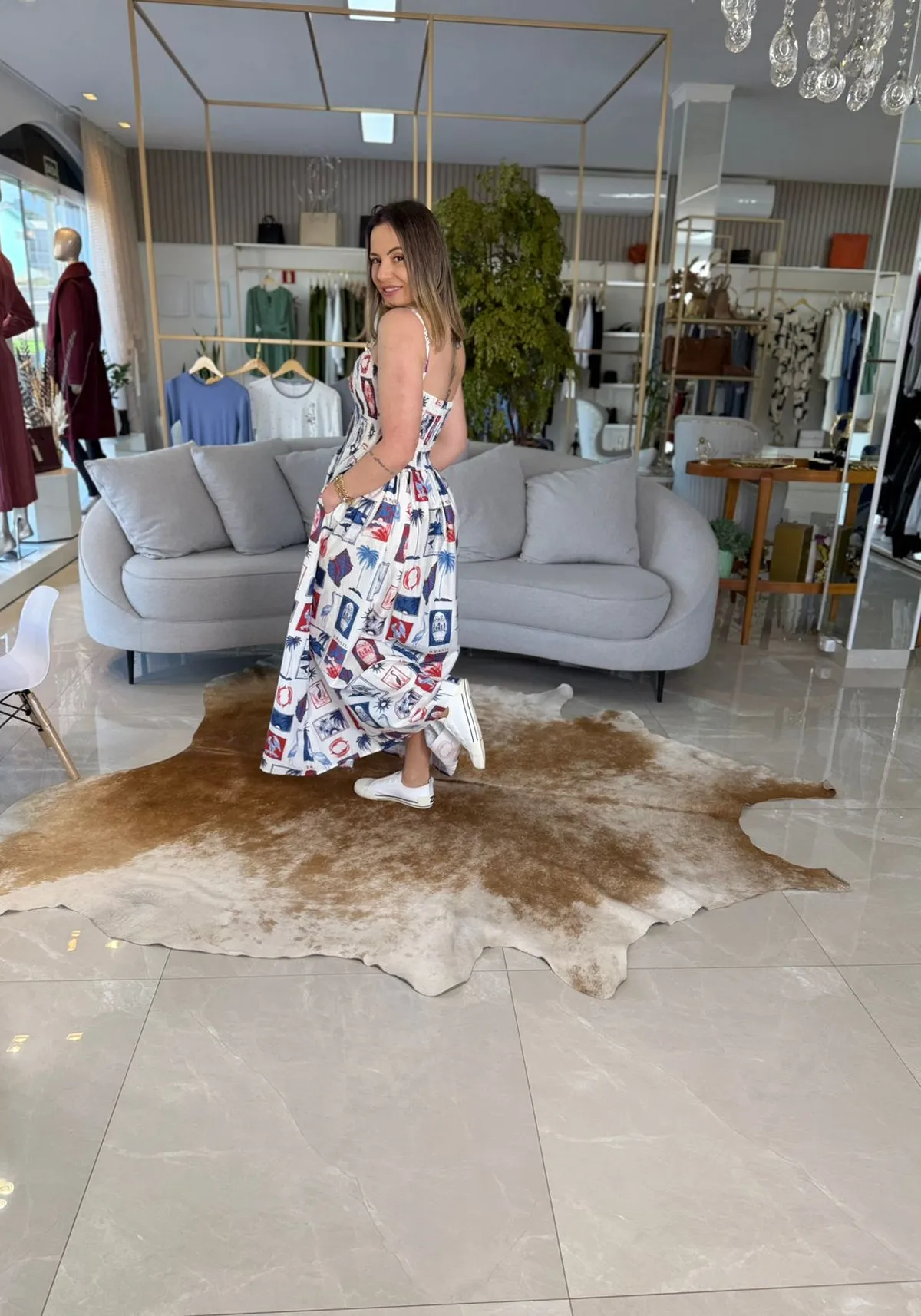 O busto em lastex valoriza a silhueta com conforto e firmeza, enquanto a saia ampla e o caimento leve garantem frescor para os dias de sol.