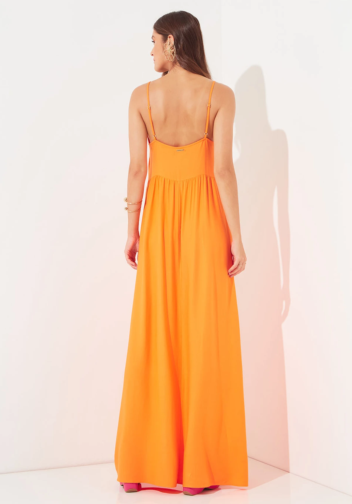 O vestido apresenta modelagem ampla, comprimento longo, sem mangas, alças finas com regulagem, decote V amplo, não possui bojo.