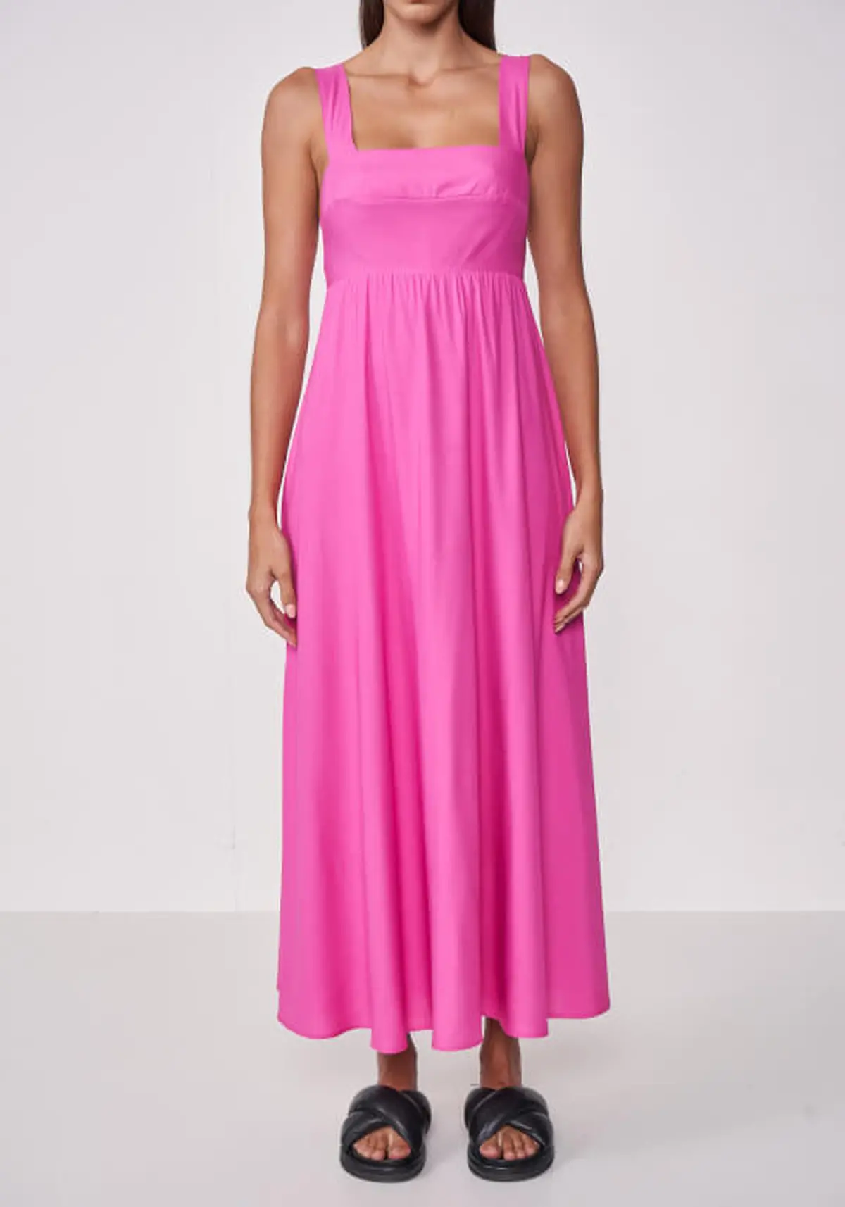 Sua saia ampla e solta adiciona movimento e textura, tornando a peça mais interessante e sofisticada, o decote quadrado destaca a área do busto de forma sutil e elegante.