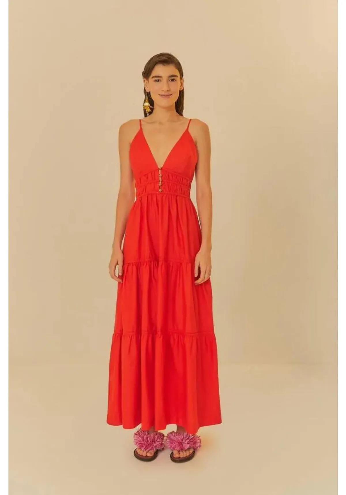 O vestido apresenta comprimento longo, modelagem ampla, shape solto, decote v alongado, alças finas com regulagem, detalhe de franzidos na cintura com botões personalizados em metal dourado na frente, não possui bojo, costas abertas.