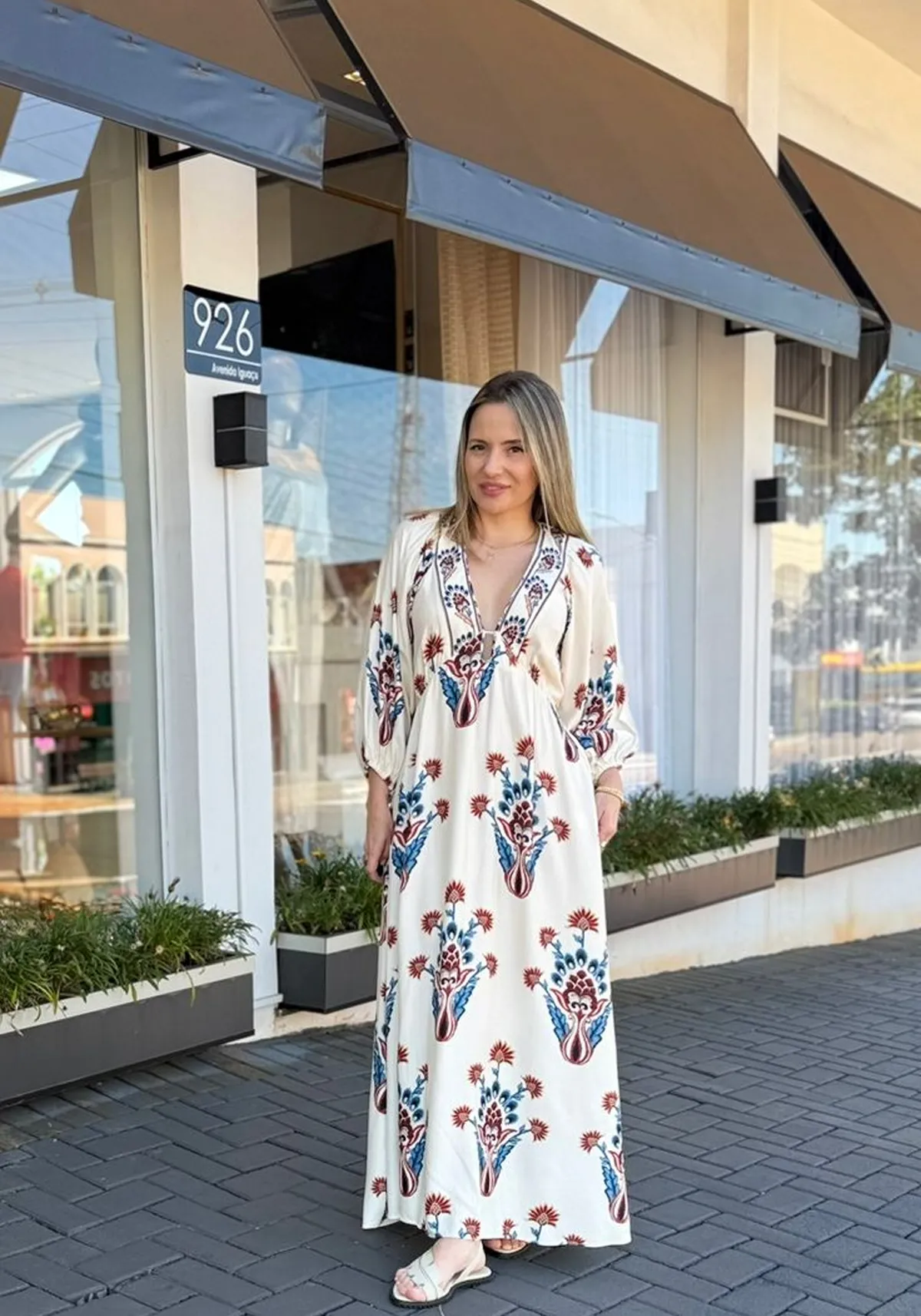 A modelagem longa com mangas soltinhas traz movimento e conforto, enquanto o caimento leve valoriza o corpo de forma natural e elegante.
