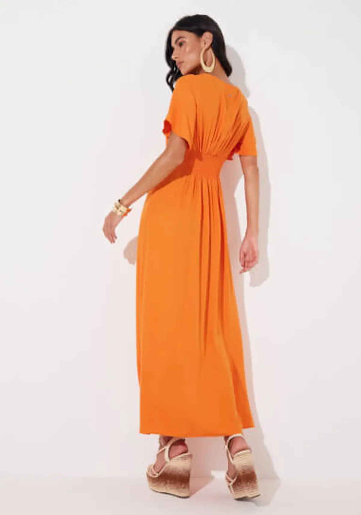 Seu decote V alongado valoriza o busto com delicadeza, possui cor laranja vibrante, que adiciona um toque alegre e moderno à peça.