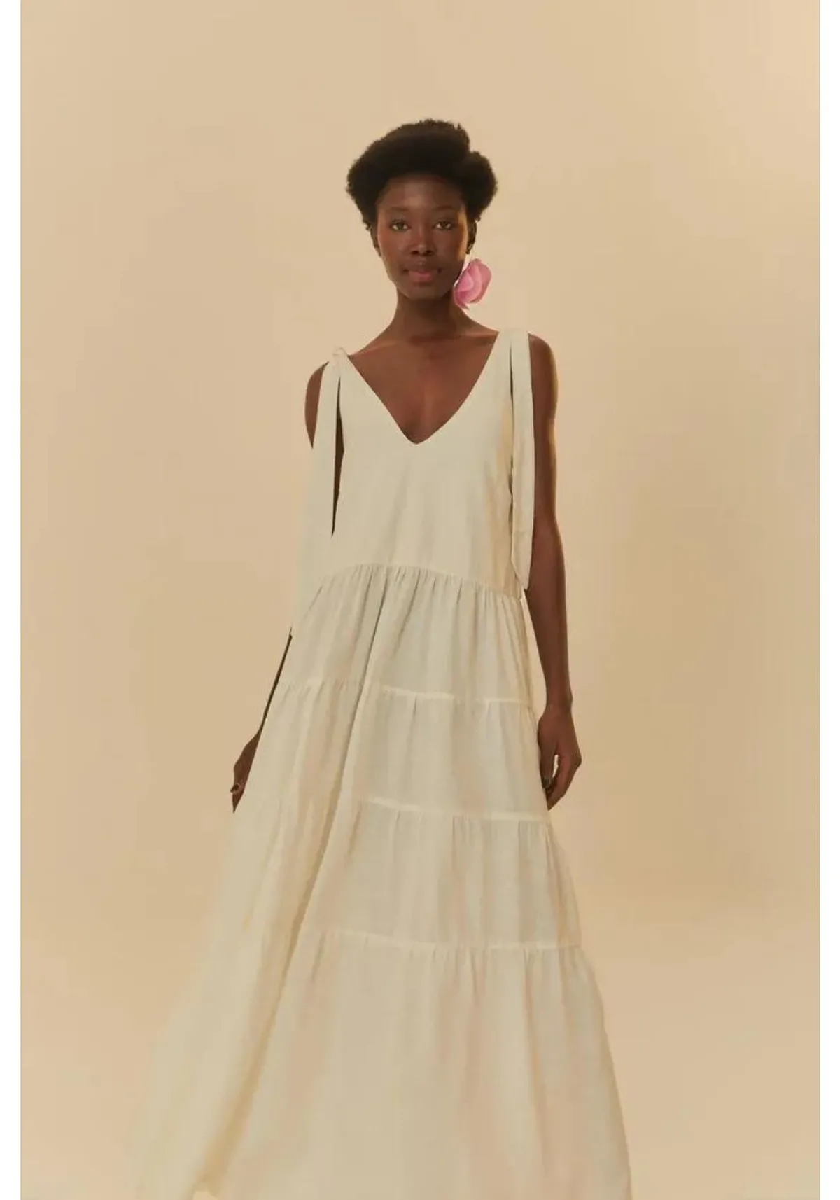 O vestido apresenta modelagem ampla, shape fluido, comprimento longo, sem mangas, alças largas com amarração no ombro, decote V profundo, forrado no busto, não possui bojo, saia com camadas.