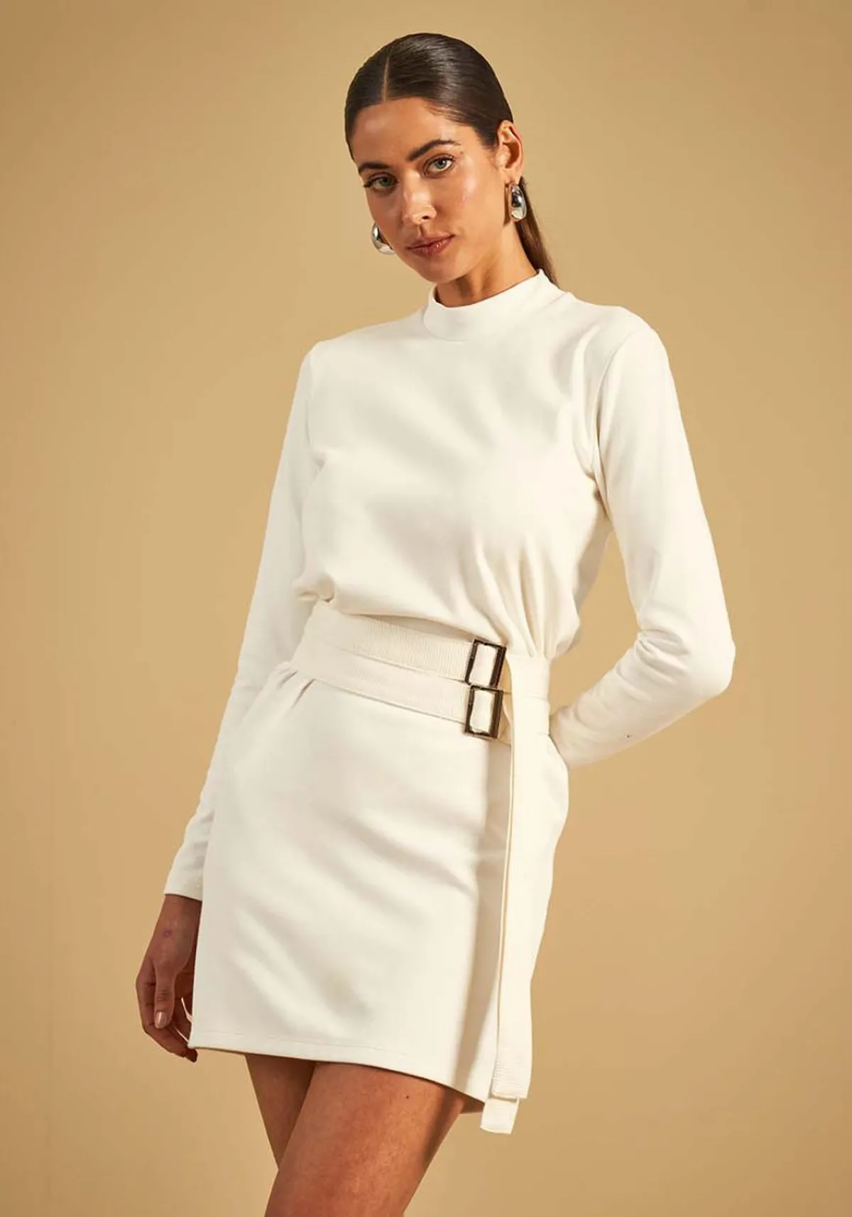 Vestido de mangas longas, detalhe de dois cintos trazendo total charme a peça.