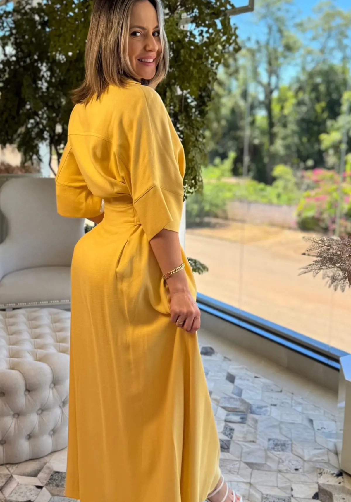 O vestido apresenta comprimento midi, modelagem ampla e solta, mangas médias retas, decote V com detalhe de torção e abertura abaixo, não possui bojo.