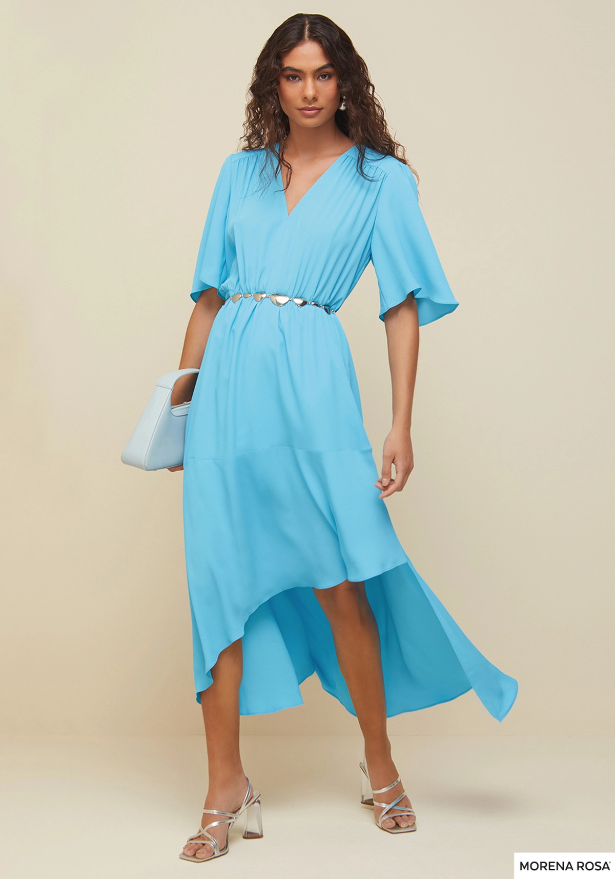 O vestido apresenta comprimento midi, modelagem ampla, shape solto, mangas curtas amplas, decote V valorizando o busto, possui elástico na cintura e acompanha cinto para amarração para melhor ajuste, saia com barra assimétrica, sendo mais comprida atrás e mais curta na frente, possui forro na saia para mais segurança, não possui bojo.