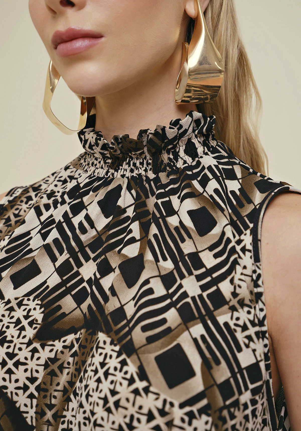 Possui gola alta em lastex, sem mangas, sem bojo, caimento solto.
