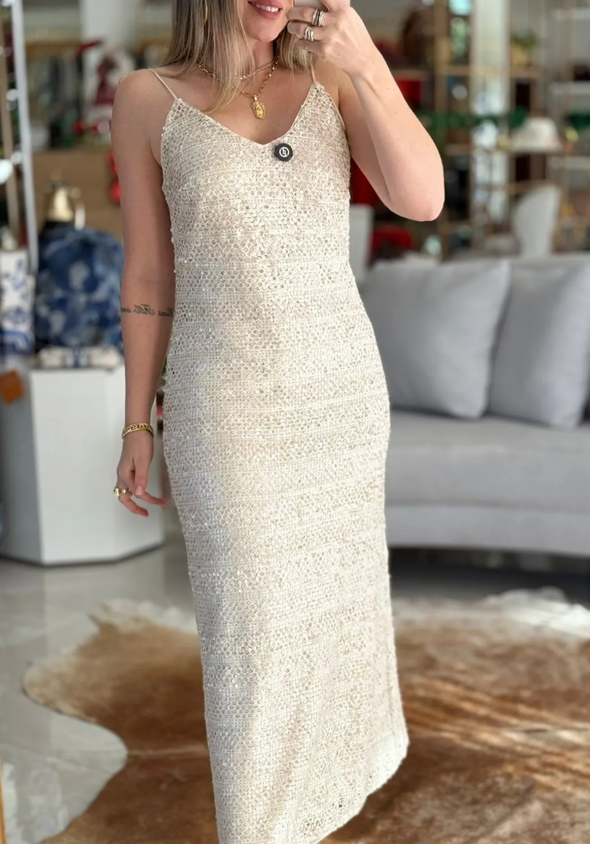 A modelagem longa alonga a silhueta e traz imponência ao look, enquanto o tom bege equilibra o brilho com sofisticação e versatilidade. O design inspirado no estilo gipsy adiciona charme e personalidade, tornando a peça perfeita para festas, eventos noturnos e produções glamourosas.