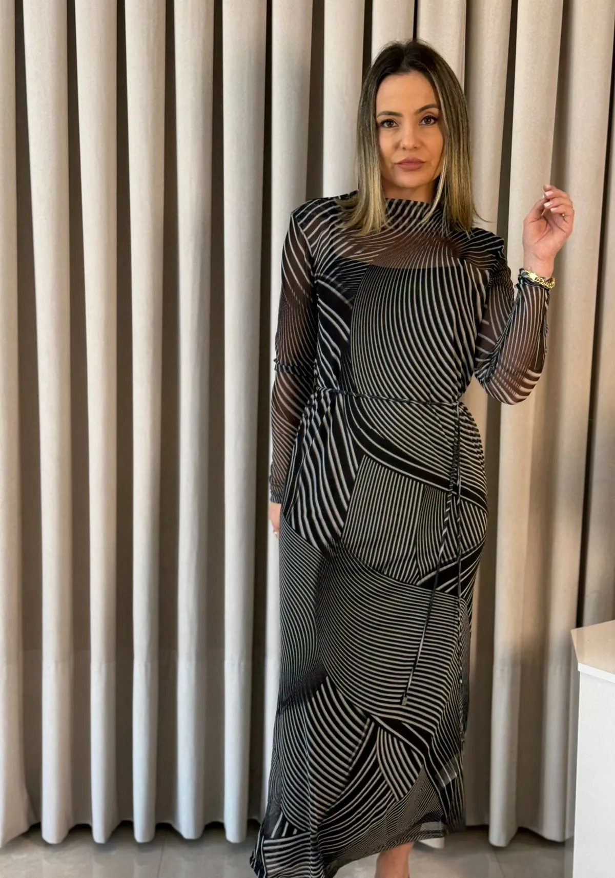 A peça traz um visual clean, perfeito para quem aprecia produções refinadas sem exageros. O preto profundo reforça a versatilidade — vai do ambiente profissional aos eventos noturnos com apenas alguns toques de acessórios.
