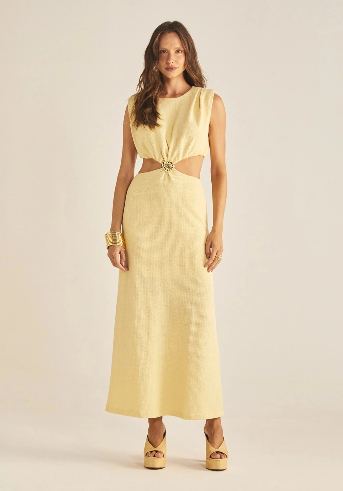 O vestido traz elegância e frescor em uma modelagem sofisticada. Confeccionado em tecido leve de toque texturizado, possui recortes estratégicos na cintura que realçam a silhueta. O destaque especial é o detalhe central em formato de concha dourada, que une as duas partes da peça, adicionando charme e exclusividade. Ideal para ocasiões que pedem um visual moderno e feminino.